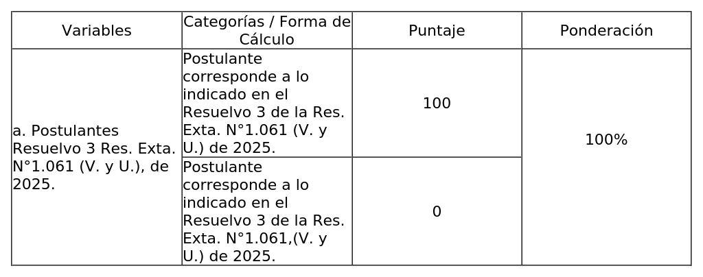 "8.1. El puntaje total individual será el resultado de la sumatoria de las ponderaciones de las siguientes variables identificadas en los cuadros del Resuelvo 8 precedente: