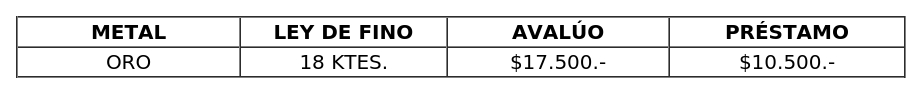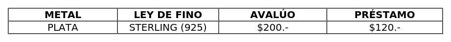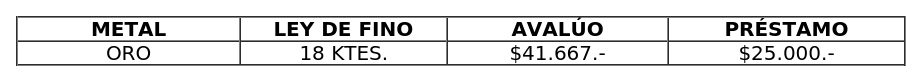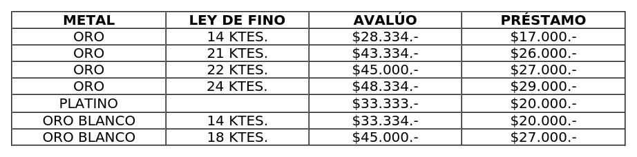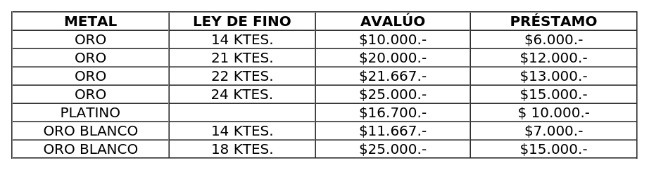 1. Fíjese nuevo avalúo por el gramo de metales nobles, utilizado por las Unidades de Crédito en el cálculo de los préstamos con garantía prendaria del rubro alhajas conforme a la siguiente tabla y las siguientes condiciones: