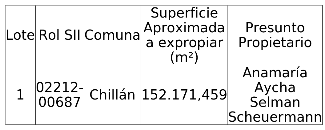 1. Que, por medio del oficio del Servicio de Vivienda y Urbanización de la Región de Ñuble, singularizado en el visto e) de este decreto, se solicitó a esta Cartera de Estado la elaboración del decreto que apruebe el Programa de Expropiaciones de la totalidad del inmueble ubicado en la comuna de Chillán, Región de Ñuble, cuyo rol de avalúo es 2212-687, con una superficie de 152.171,459 m², aparentemente propiedad de doña Anamaría Aycha Selman Scheuermann, para la ejecución del Proyecto "Construcción Parque La Rufina, Chillán".