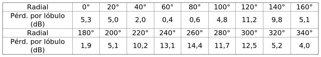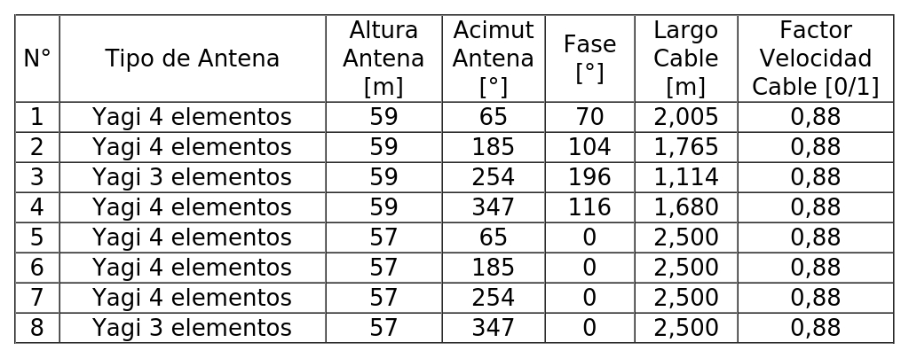 - Arreglo de antenas de acuerdo a la siguiente tabla: