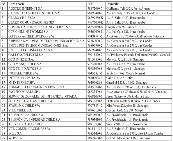 Con el fin de identificar el universo de entidades potencialmente comprendidas en la definición de servicios de telecomunicaciones, esta Agencia ofició a la Subsecretaría de Telecomunicaciones (en adelante "Subtel") para obtener la nómina de instituciones reguladas bajo su competencia. En respuesta, a través de oficio 5750/2025, Subtel remitió información relativa a cuatro categorías de actores del sector: grandes operadores, concesionarios de servicios públicos, concesionarios de servicios intermedios y permisionarios de servicios limitados.