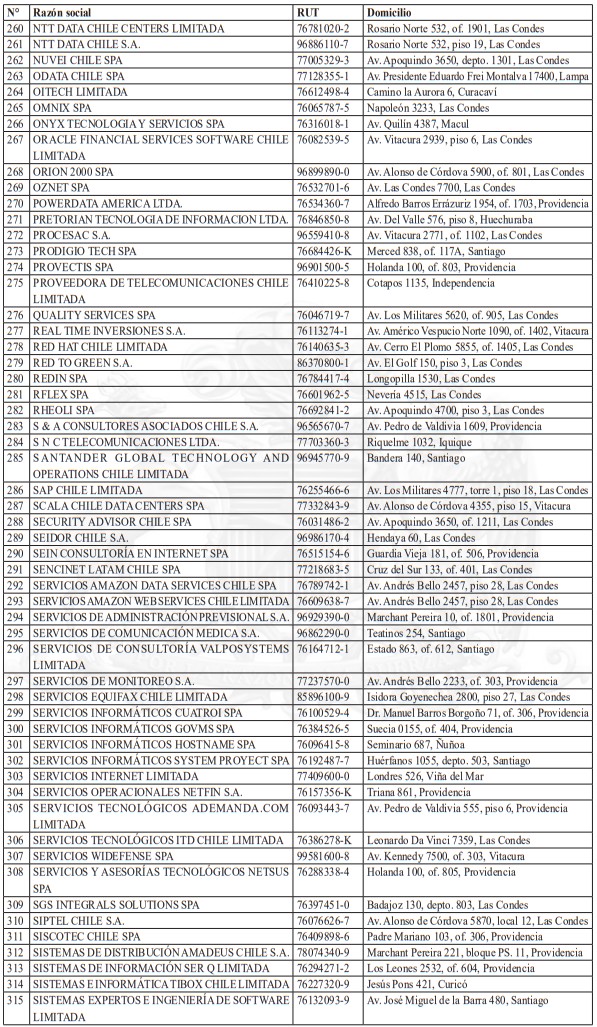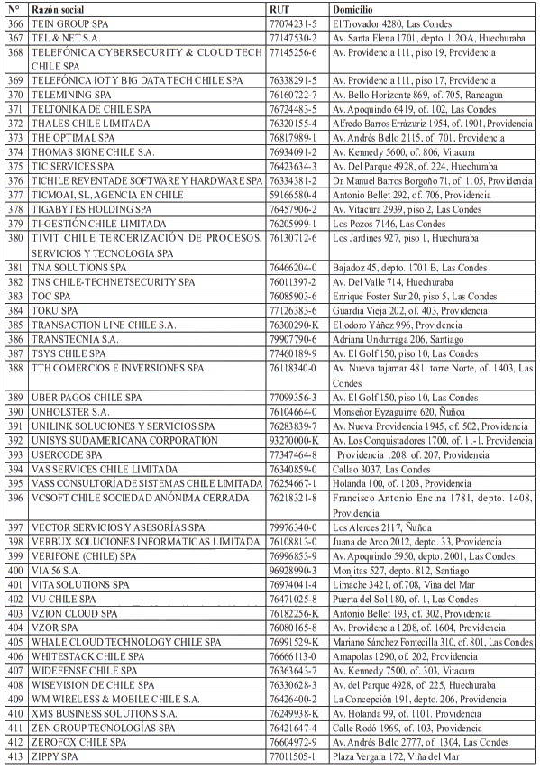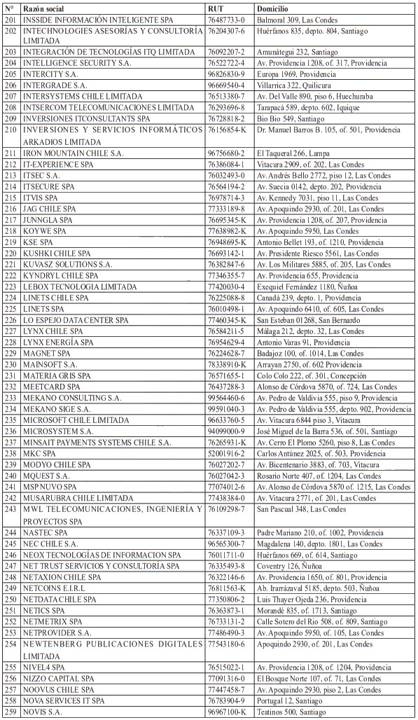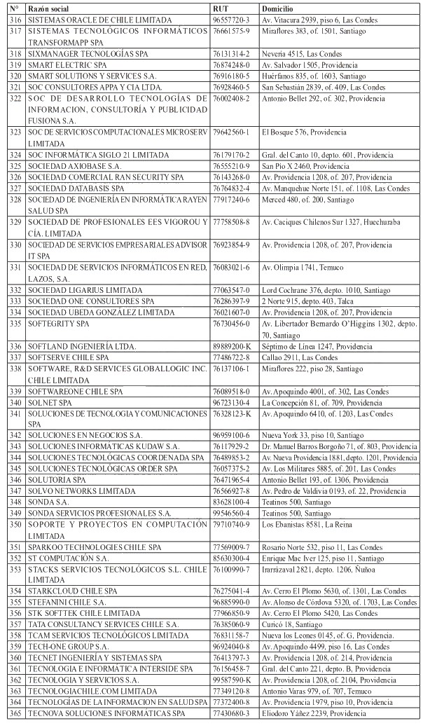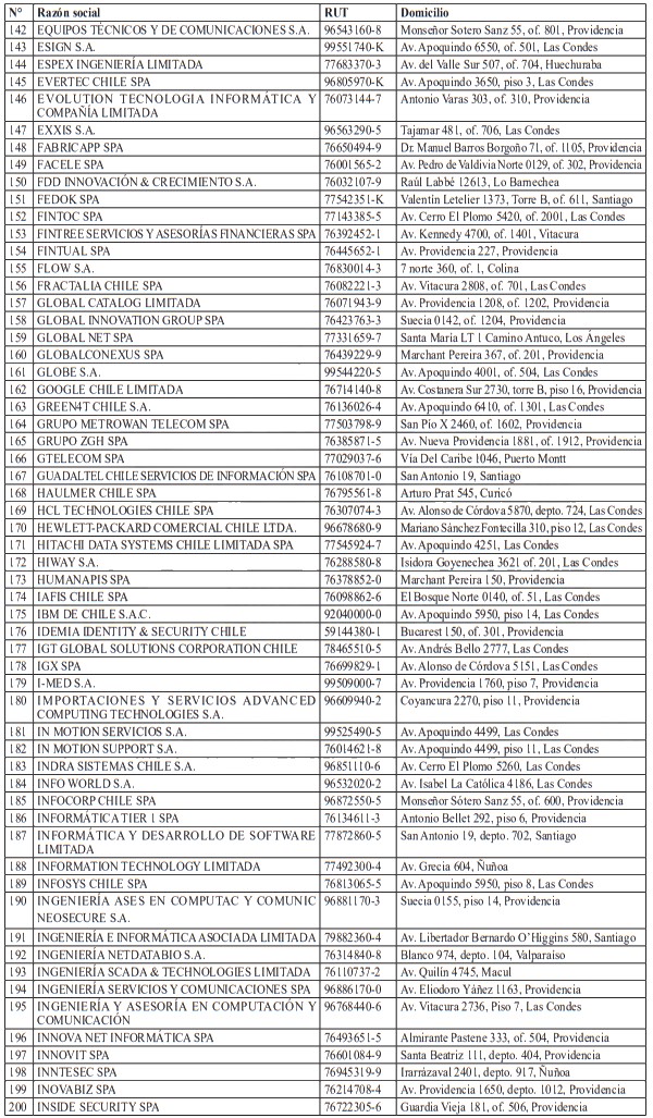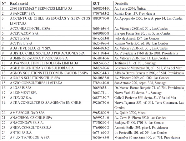 Para realizar el análisis de este sector, y en virtud del principio de coordinación administrativa, la Agencia solicitó a diversos organismos de la Administración del Estado el envío de información relativa al universo de empresas que participan o intervienen en su sector regulado. En particular, la Agencia remitió al Servicio de Impuestos Internos el oficio secreto N°13, de 2025, mediante el cual requirió un informe respecto de las empresas cuyas actividades contemplaran al menos uno de los siguientes códigos de actividad económica: 620100, 620200, 620900, 631100 y 639900. La inclusión de estos códigos obedeció a un examen pormenorizado respecto de los servicios proveídos por las empresas del sector digital.
