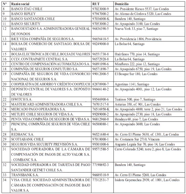Sobre las instituciones bancarias, se consideraron como criterios de inclusión en la nómina final de OIV, la calificación anual de bancos de importancia sistémica efectuada por la Comisión para el Mercado Financiero, en conformidad a lo dispuesto en el Capítulo 21-11 de la Recopilación Actualizada de Normas, como también la opinión técnica de la citada Comisión, emitida especialmente en el marco de este proceso. Asimismo, atendiendo al impacto que la afectación de una entidad bancaria puede generar en el acceso cotidiano de la ciudadanía a servicios bancarios, se consideró la prestación de servicios financieros dirigidos a personas naturales -como cuentas corrientes, captación de depósitos, créditos de consumo y créditos de vivienda-, y se valoró la presencia territorial que mantiene la entidad bancaria, considerando por ejemplo si cuentan con sucursales a lo largo del país y en diversas regiones.