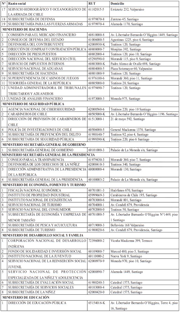 "Para efectos de esta ley, la Administración del Estado estará compuesta por los Ministerios, las Delegaciones Presidenciales Regionales y Provinciales, los Gobiernos Regionales, las Municipalidades, las Fuerzas Armadas, las Fuerzas de Orden y Seguridad Pública, las empresas públicas creadas por ley, y los órganos y servicios públicos creados para el cumplimiento de la función administrativa.