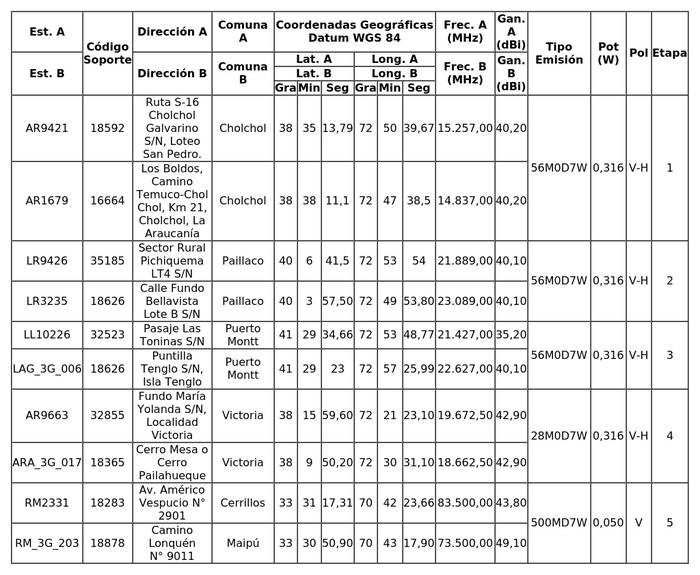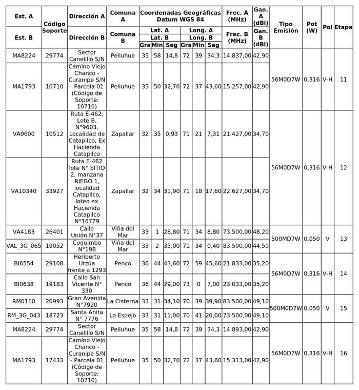 1. Autorízase a la concesionaria para instalar, operar y explotar dieciséis (16) radioenlaces punto a punto a lo largo del territorio nacional según se indica a continuación:
