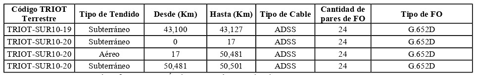 . Las pérdidas ópticas máximas por filamento de fibra óptica por TRIOT Terrestre son menores que 0,275 [dB/km] para la longitud de onda 1550 [nm] y 0,550 [dB/km] para la longitud de onda 1310 [nm].