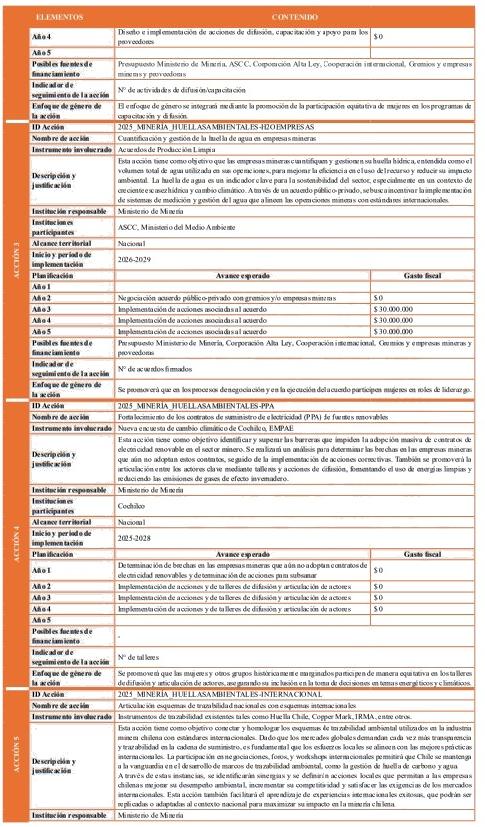 Además, el plan incluye medidas transversales orientadas a la planificación y monitoreo, tales como el fortalecimiento de la EMPAE y la creación de una encuesta específica para evaluar el avance de la implementación. También se establecen medios de implementación para la trazabilidad y transparencia de las huellas ambientales de la industria minera, facilitando el seguimiento de los impactos ambientales del sector. Para consolidar las capacidades del Ministerio de Minería, Sernageomin y Cochilco, se plantea contratar profesionales especializados en temas climáticos. Otros medios de implementación se centran en la planificación estratégica de la descarbonización en la minería y en el análisis de riesgos climáticos específicos del sector.