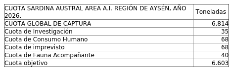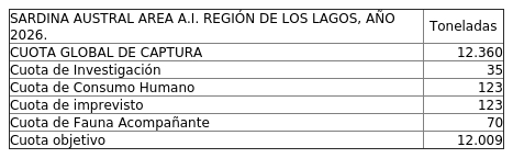 Por decreto exento Nº 202500239, de este Ministerio, fíjase para el año 2026 las siguientes cuotas globales de captura para el recurso Sardina austral a ser extraídas en el área de aguas interiores de la Región de Los Lagos y de la Región de Aysén del General Carlos Ibáñez del Campo, expresadas en toneladas, según se indica: