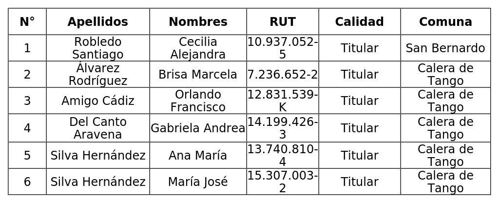 Artículo primero: Regularízase el traspaso desde los municipios de San Bernardo y Calera de Tango al Servicio Local de Educación Pública Del Pino a los profesionales de la educación que se individualizan a continuación, a contar del uno de enero de 2025: