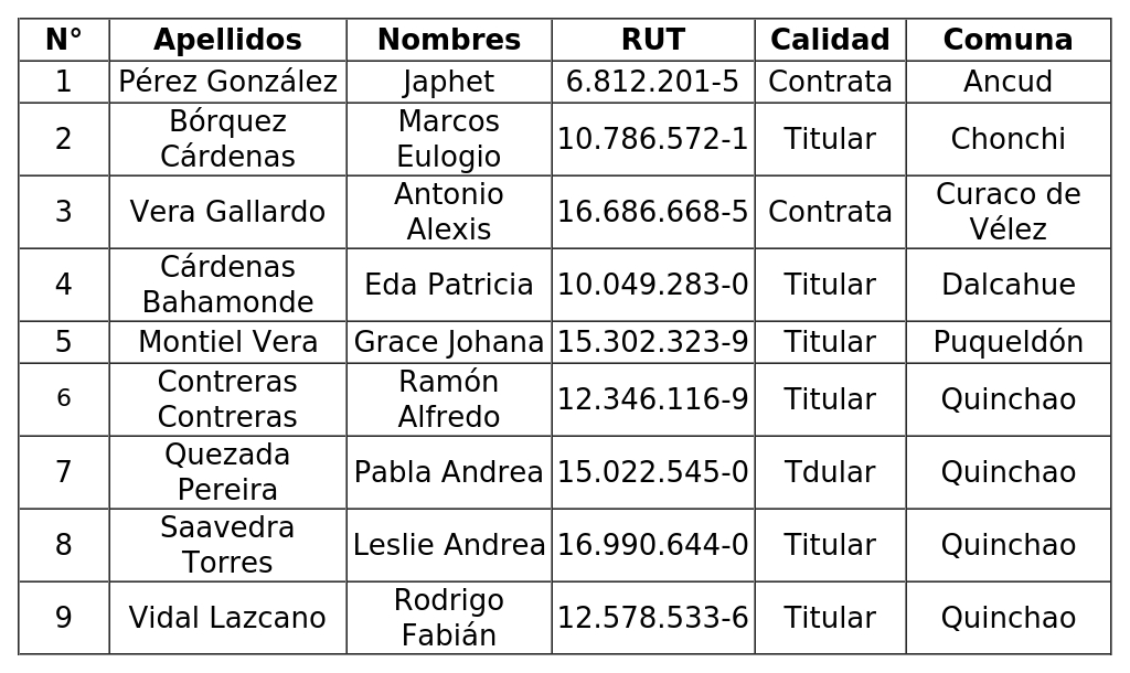 Lo dispuesto en la Ley Nº 21.040, que Crea el Sistema de Educación Pública; en la Ley Nº 18.956, que Reestructura el Ministerio de Educación Pública; en el DFL Nº 36, de 2018, del Ministerio de Educación, que Fija Planta de Personal del Servicio Local de Educación Pública de la Región de Los Lagos que comprende las comunas de Castro, Ancud, Chonchi, Curaco de Vélez, Dalcahue, Puqueldón, Queilén, Quellón, Quemchi y Quinchao y otras materias que indica; en la Ley Nº 21.640, de Presupuestos del Sector Público correspondiente al año 2024; en el decreto supremo Nº 73, de 2018, del Ministerio de Educación, que Fija ámbito de competencia territorial de los Servicios Locales de Educación Pública que indica; en el decreto supremo Nº 162, de 2022, del Ministerio de Educación, que Fija denominación, ámbito de competencia territorial, domicilio y calendario de instalación con las fechas en que iniciarán funciones los Servicios Locales de Educación Pública que indica; en el decreto exento Nº 232, de 2025, del Ministerio de Educación, que Regulariza Individualización del Personal que se Traspasará desde las municipalidades de Castro, Ancud, Chonchi, Curaco de Vélez, Dalcahue, Puqueldón, Queilén, Quellón, Quemchi y Quinchao al Servicio Local de Educación Pública de Chiloé, según lo dispuesto en el artículo trigésimo noveno transitorio de la ley Nº 21.040; en los Ords. Nºs. 101 y 568, de 2025, ambos de la Corporación Municipal de Ancud; en el Ord. Nº 2.752, de 2025, de la Dirección de Educación Pública, que complementa Ord. Nº 2.723, de 2024, de la Dirección de Educación Pública, con información que indica sobre personal municipal regido por el Estatuto Docente de las comunas pertenecientes al Servicio Local de Chiloé; y, en la resolución Nº 36, de 2024, de la Contraloría General de la República.