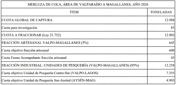 Por decreto exento N° 202500251, de este Ministerio, fíjase para el año 2026, una cuota global de captura de 12.988 toneladas para el recurso merluza de cola, en el área marítima comprendida entre las regiones de Valparaíso, del Libertador General Bernardo O'Higgins, del Maule, de Ñuble, del Biobío, de La Araucanía, de Los Ríos, de Los Lagos, de Aysén del General Carlos Ibáñez del Campo y de Magallanes y de la Antártica Chilena, de la siguiente manera:
