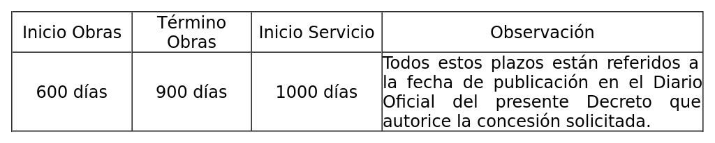 5. Los plazos de inicio y término de obras, y de inicio del servicio son los que a continuación se indican: