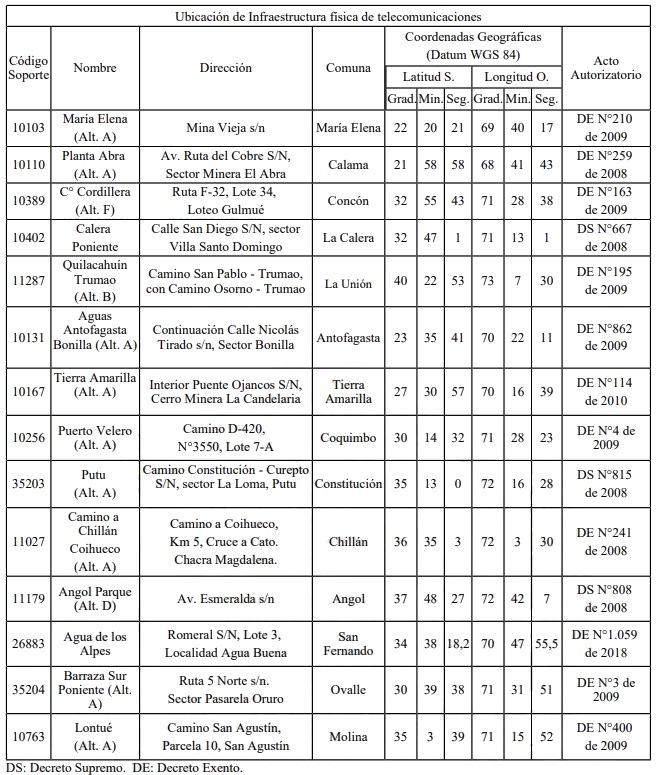 e) El decreto supremo N° 99 de 2012, del Ministerio de Transportes y Telecomunicaciones, que fija el reglamento que establece los requisitos para obtener, instalar, operar y explotar concesiones de servicios intermedios de telecomunicaciones que únicamente provean infraestructura física para telecomunicaciones.