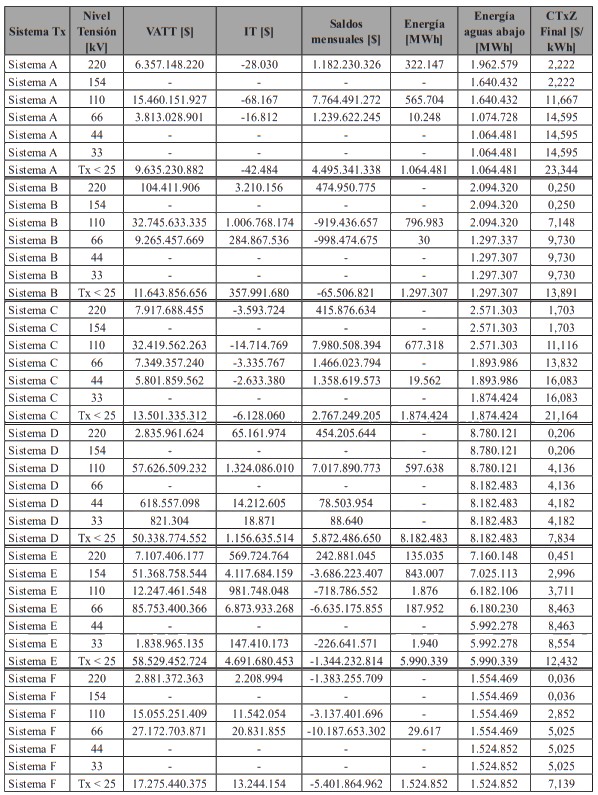 Un resumen del cálculo anterior se presenta en la Tabla 22, separado por sistema zonal y nivel de tensión: