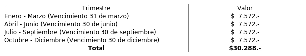 1. Apruébese la tarifa anual por concepto de servicio de aseo domiciliario en la comuna de Taltal, correspondiente al ejercicio del año 2026, la cual se fija en la suma de $30.288 (treinta mil doscientos ochenta y ocho) pesos, con goce de plena vigencia legal. Dicho monto deberá ser enterado por los contribuyentes en forma fraccionada y con carácter trimestral, conforme al detalle que se establecerá en la presente resolución, todo ello en cumplimiento de lo dispuesto en la normativa vigente y en la Ordenanza Municipal que determina el procedimiento para fijar tarifa de aseo domiciliario, forma de cobro y exenciones:
