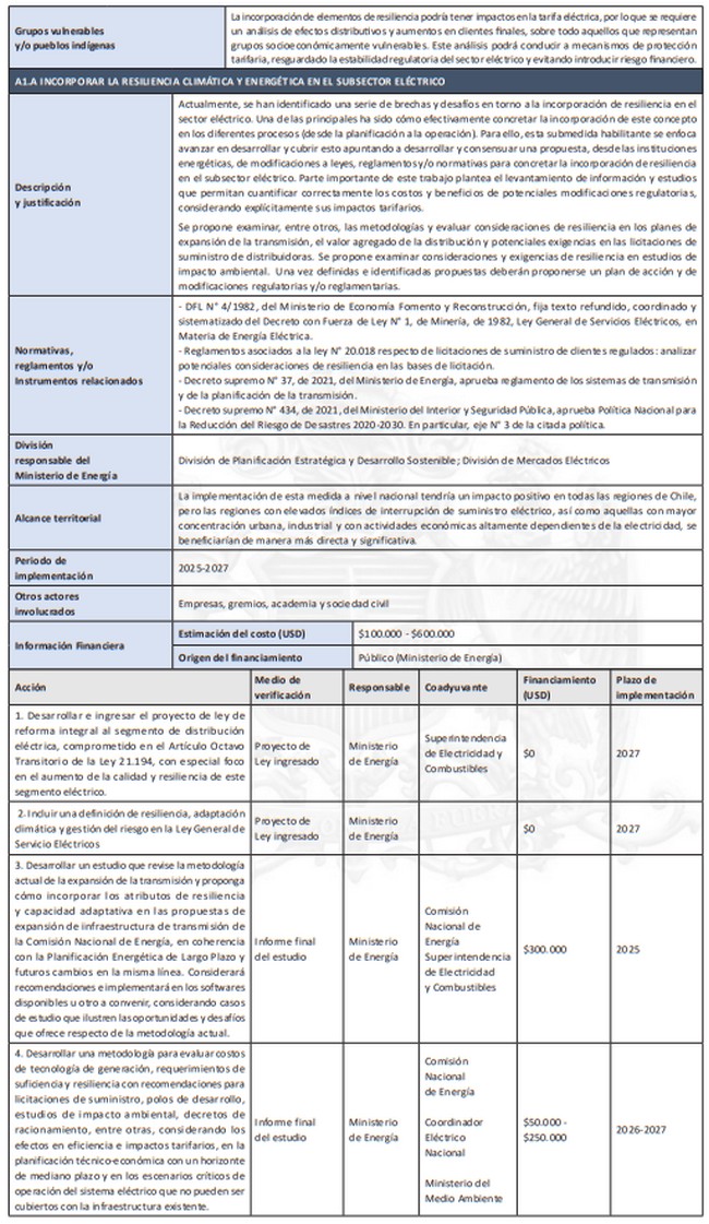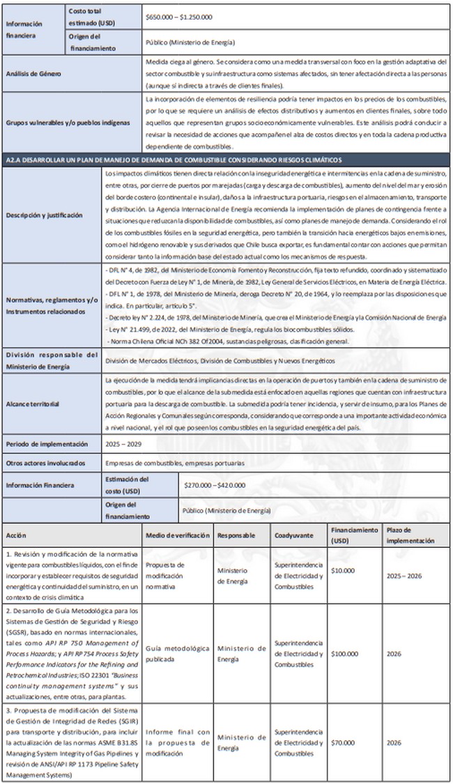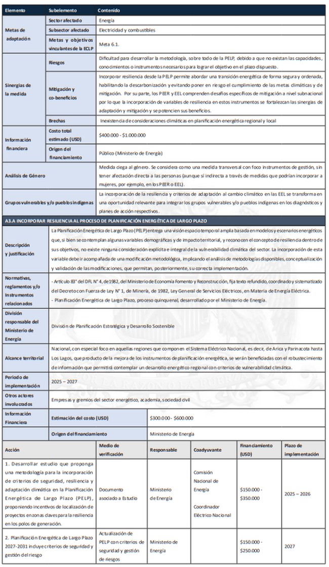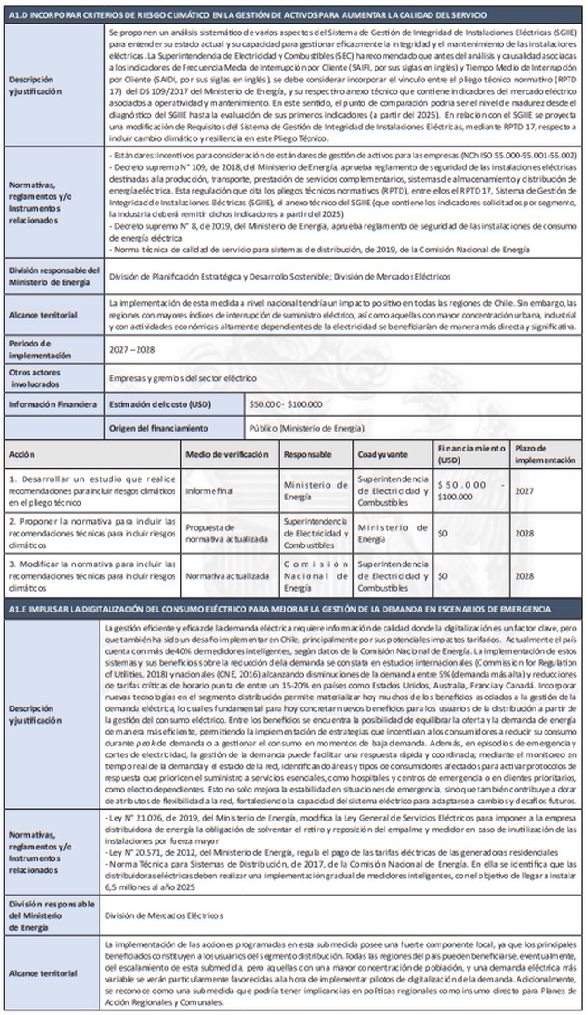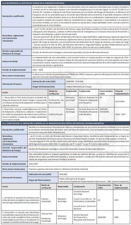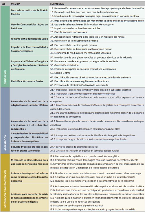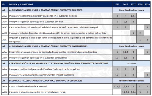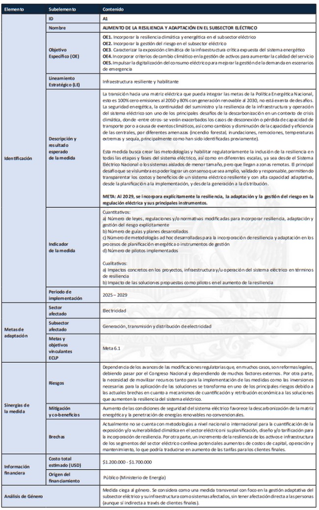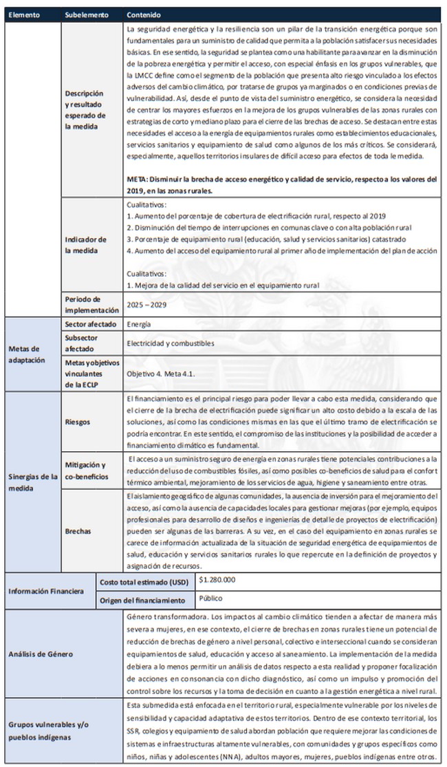 Respecto a las medidas de adaptación, estas se basan en las necesidades derivadas de los principales riesgos climáticos que enfrenta el sector, donde estos han sido identificados para los segmentos del sector, tanto en electricidad como en combustibles: la generación eléctrica, afectada principalmente por las variaciones de temperatura, sequía, eventos hidrometeorológicos extremos y variabilidad climática; la transmisión y distribución eléctrica, impactada principalmente por el aumento de temperatura, impactos ambientales y aluviones; la demanda energética, que se ve afecta por los cambios en los patrones de consumo por efectos del cambio climático, el acceso a la energía y la pobreza energética; y los puertos e infraestructura de combustibles, que sufre las consecuencias de marejadas, aumento del nivel del mar, eventos hidrometeorológicos extremos. Así, las medidas de adaptación se centran en la actualización de la regulación energética para incorporar criterios de resiliencia y adaptación climática como habilitante de su inclusión efectiva, el desarrollo de metodologías para los diferentes procesos de la planificación, operación e infraestructura del sector con el fin de cuantificar e internalizar los costos y beneficios de un sistema más resiliencia de forma costo-efectiva y garantizando los menores impactos a las tarifas y estabilidad regulatoria, la caracterización de la exposición climática y vulnerabilidad de la infraestructura crítica en un contexto de crisis climática y, finalmente, el cierre de la brecha de electrificación rural, garantizando un servicio energético de calidad con especial foco en grupos vulnerables. Ello decanta en cuatro medidas con 11 submedidas, donde se han priorizado en cuanto a urgencia, es decir, su grado de importancia en cuanto a la habilitación de otras acciones (por ejemplo, cambios regulatorios) y costo-efectividad, dado que son priorizadas en la ejecución aquellas sin costo adicional o que ya cuentan con fuente financiamiento.