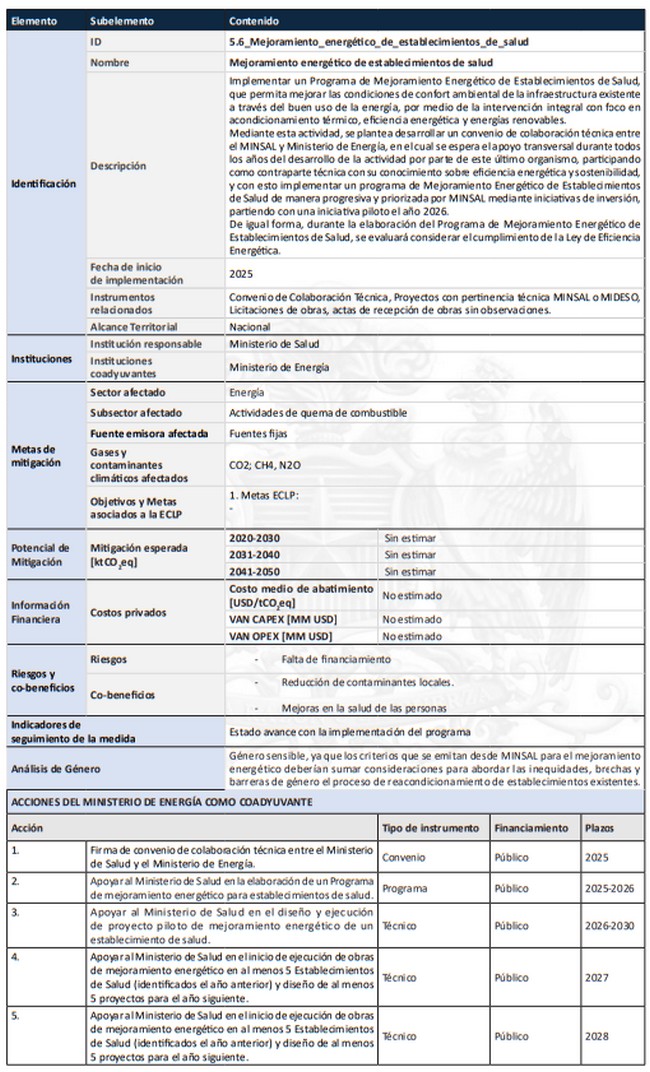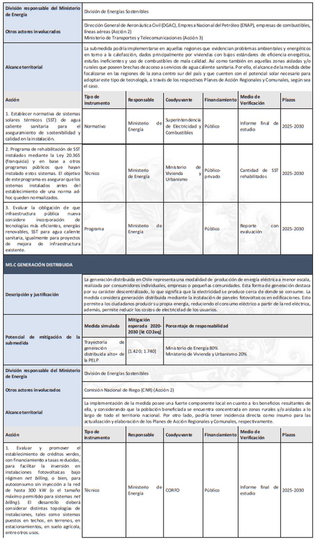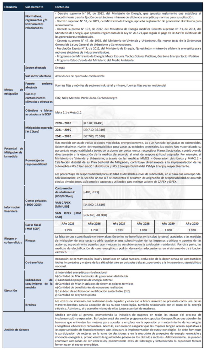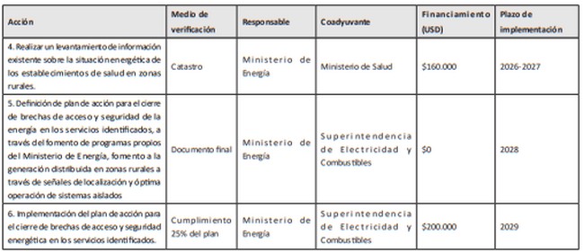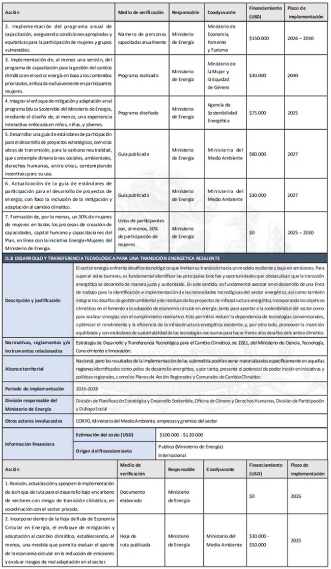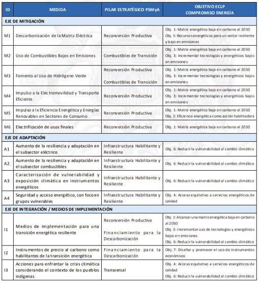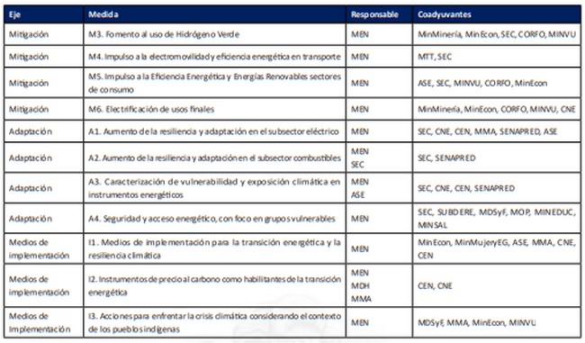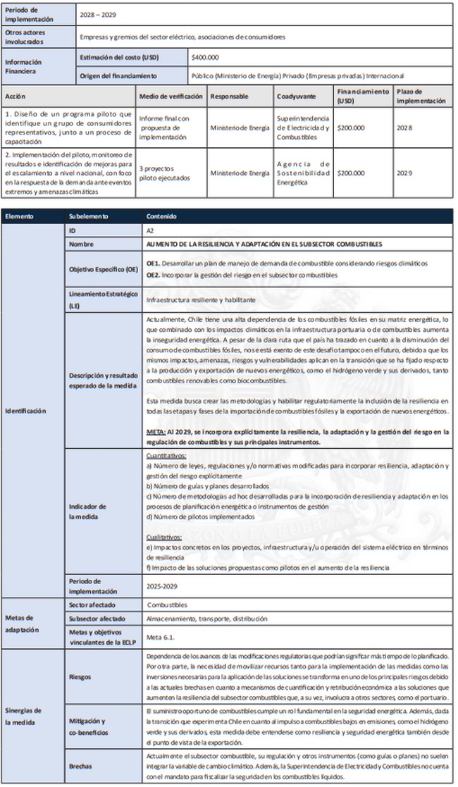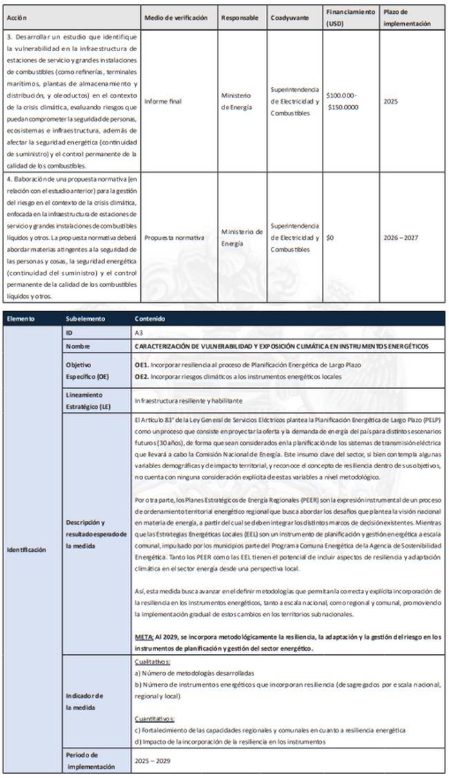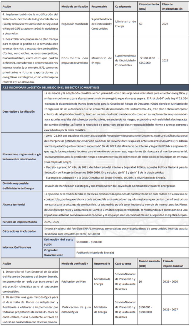 Respecto a las medidas de adaptación, estas se basan en las necesidades derivadas de los principales riesgos climáticos que enfrenta el sector, donde estos han sido identificados para los segmentos del sector, tanto en electricidad como en combustibles: la generación eléctrica, afectada principalmente por las variaciones de temperatura, sequía, eventos hidrometeorológicos extremos y variabilidad climática; la transmisión y distribución eléctrica, impactada principalmente por el aumento de temperatura, impactos ambientales y aluviones; la demanda energética, que se ve afecta por los cambios en los patrones de consumo por efectos del cambio climático, el acceso a la energía y la pobreza energética; y los puertos e infraestructura de combustibles, que sufre las consecuencias de marejadas, aumento del nivel del mar, eventos hidrometeorológicos extremos. Así, las medidas de adaptación se centran en la actualización de la regulación energética para incorporar criterios de resiliencia y adaptación climática como habilitante de su inclusión efectiva, el desarrollo de metodologías para los diferentes procesos de la planificación, operación e infraestructura del sector con el fin de cuantificar e internalizar los costos y beneficios de un sistema más resiliencia de forma costo-efectiva y garantizando los menores impactos a las tarifas y estabilidad regulatoria, la caracterización de la exposición climática y vulnerabilidad de la infraestructura crítica en un contexto de crisis climática y, finalmente, el cierre de la brecha de electrificación rural, garantizando un servicio energético de calidad con especial foco en grupos vulnerables. Ello decanta en cuatro medidas con 11 submedidas, donde se han priorizado en cuanto a urgencia, es decir, su grado de importancia en cuanto a la habilitación de otras acciones (por ejemplo, cambios regulatorios) y costo-efectividad, dado que son priorizadas en la ejecución aquellas sin costo adicional o que ya cuentan con fuente financiamiento.