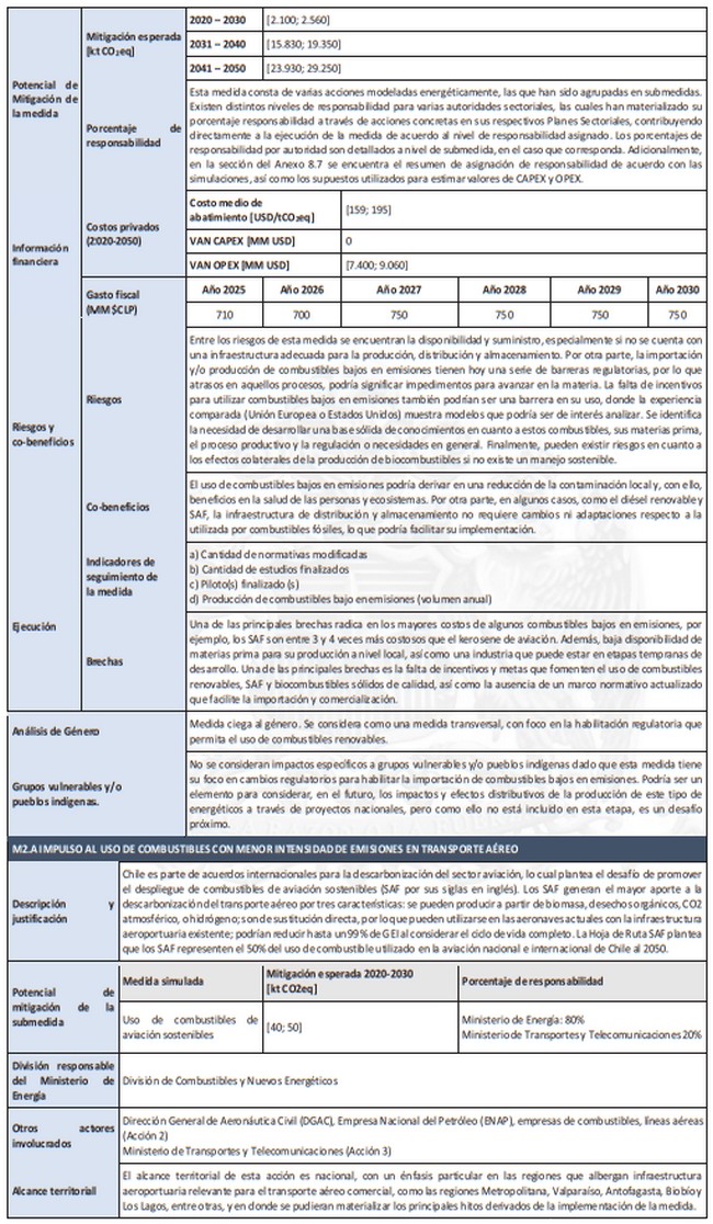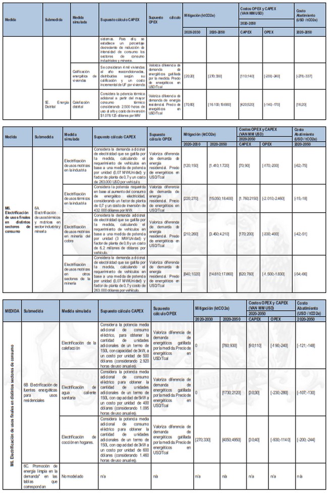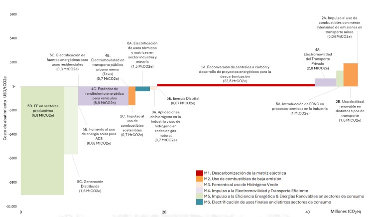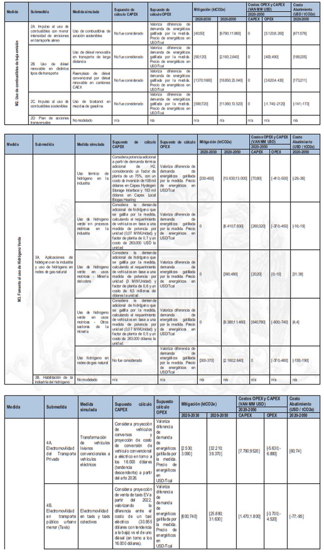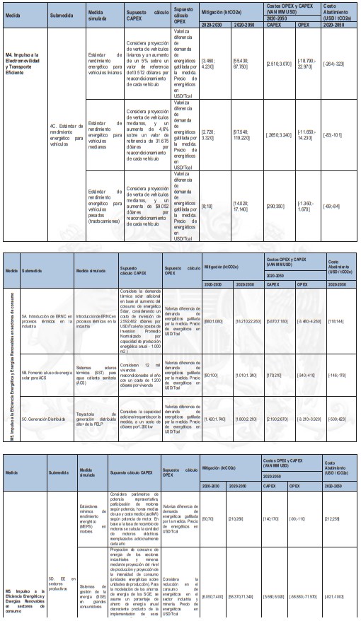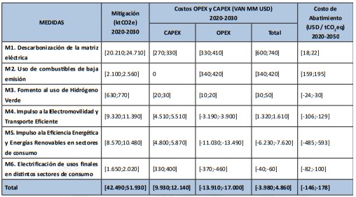 En términos del nivel de costo-efectividad de las medidas, se estimaron los costos OPEX y CAPEX de cada submedida, lo que permitió obtener los costos de abatimiento asociados, cuyo promedio del total de medidas está entre -146 y -178 USD/tCO2eq, es decir el paquete de medidas es costo efectivo. A un costo de abatimiento en torno a los 20 USD/tCO2, la medida M1 es fundamental en el cumplimiento de la meta sectorial.