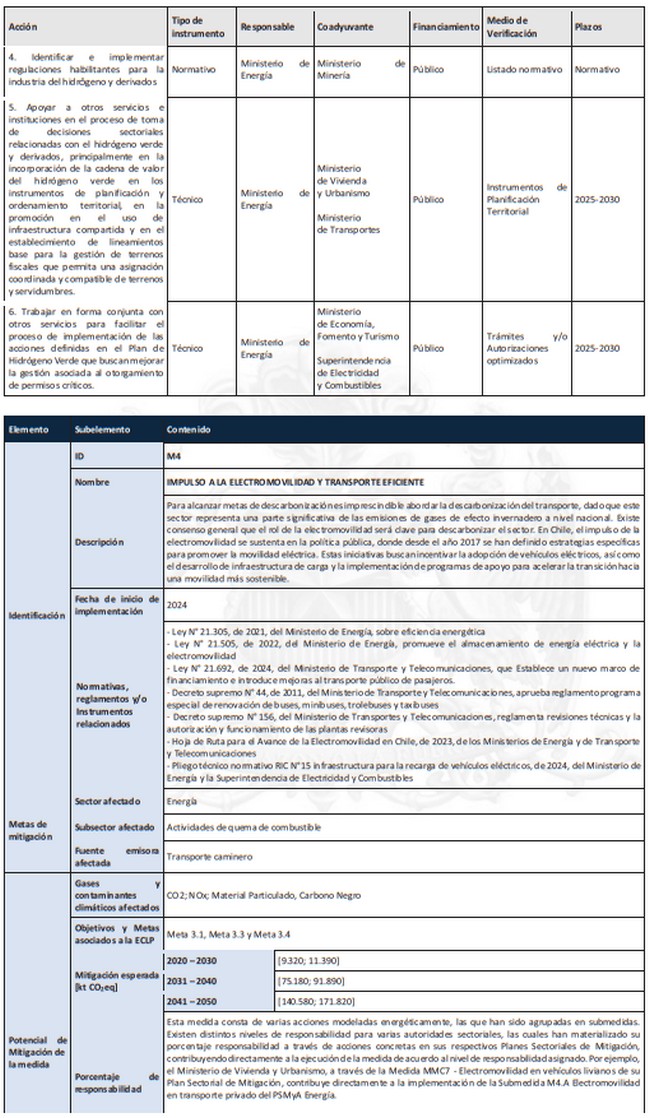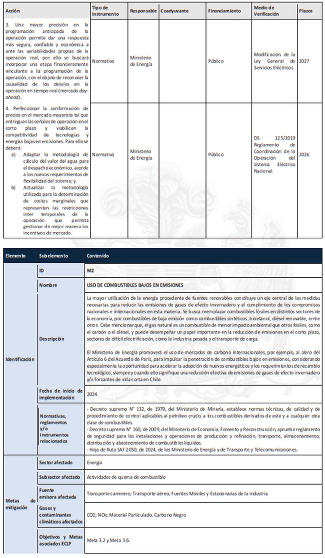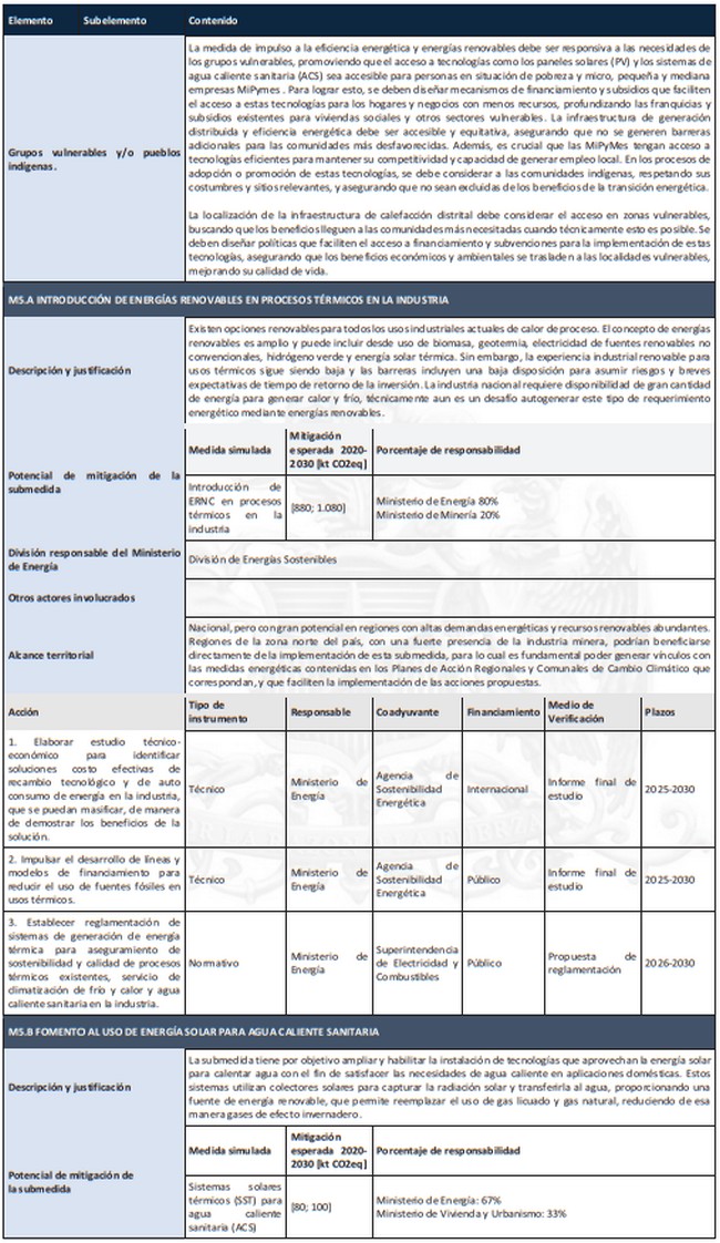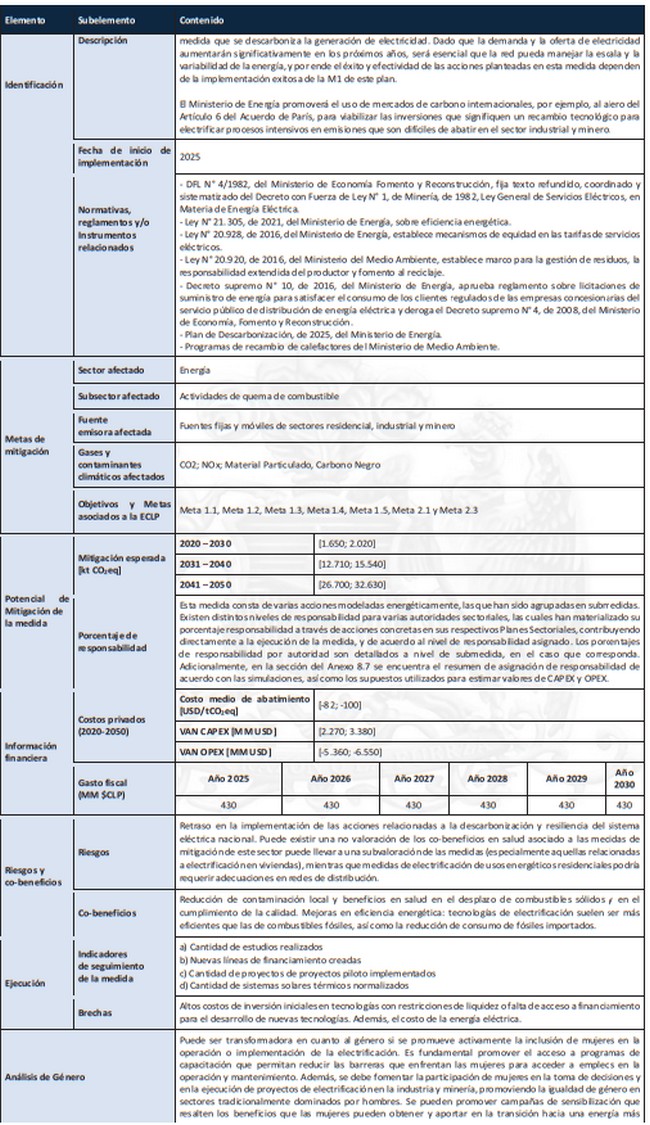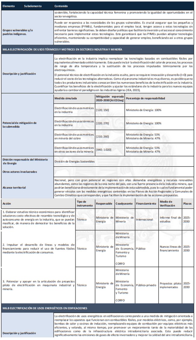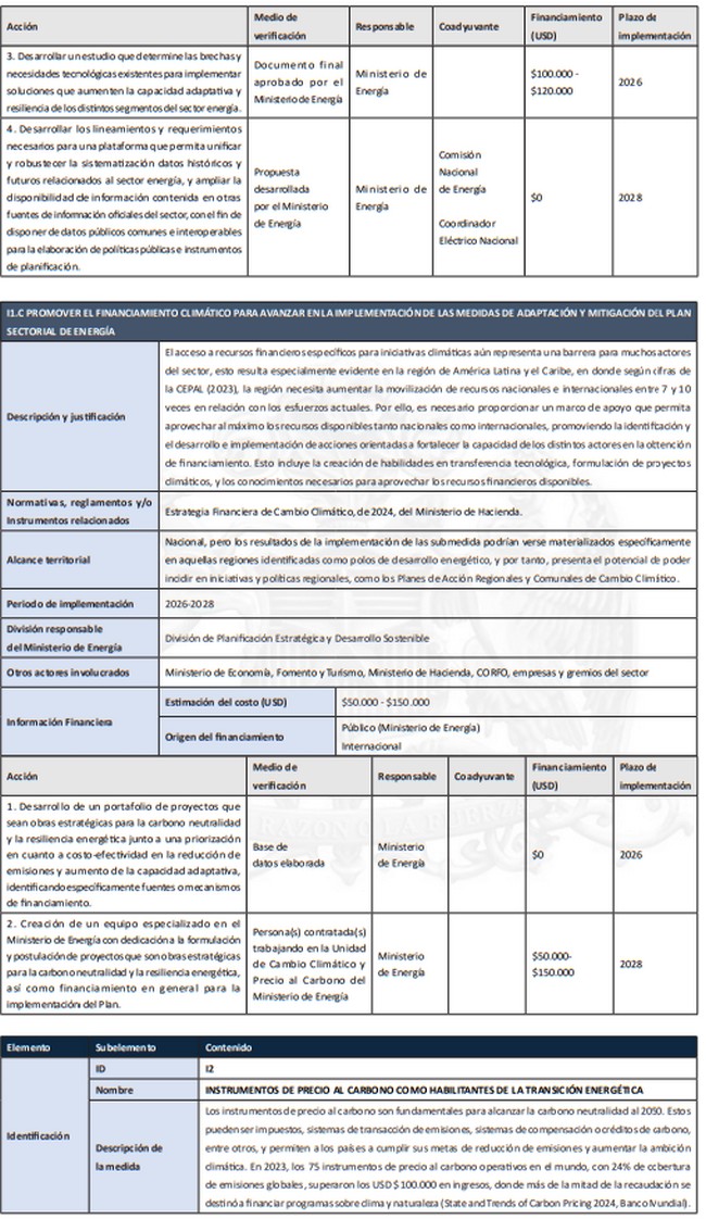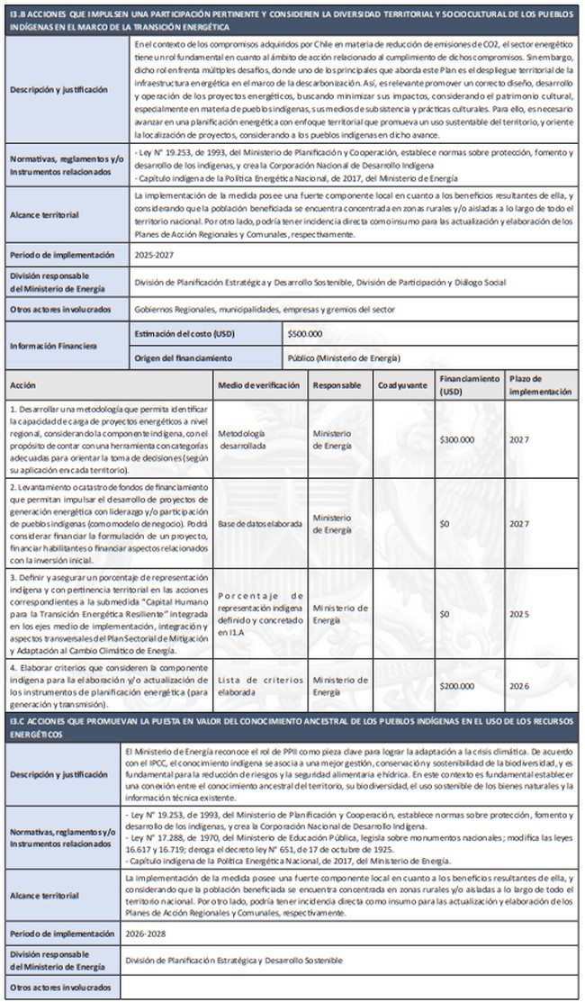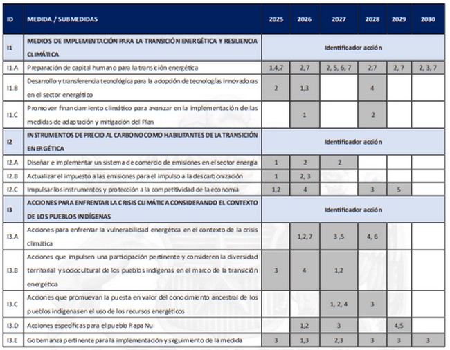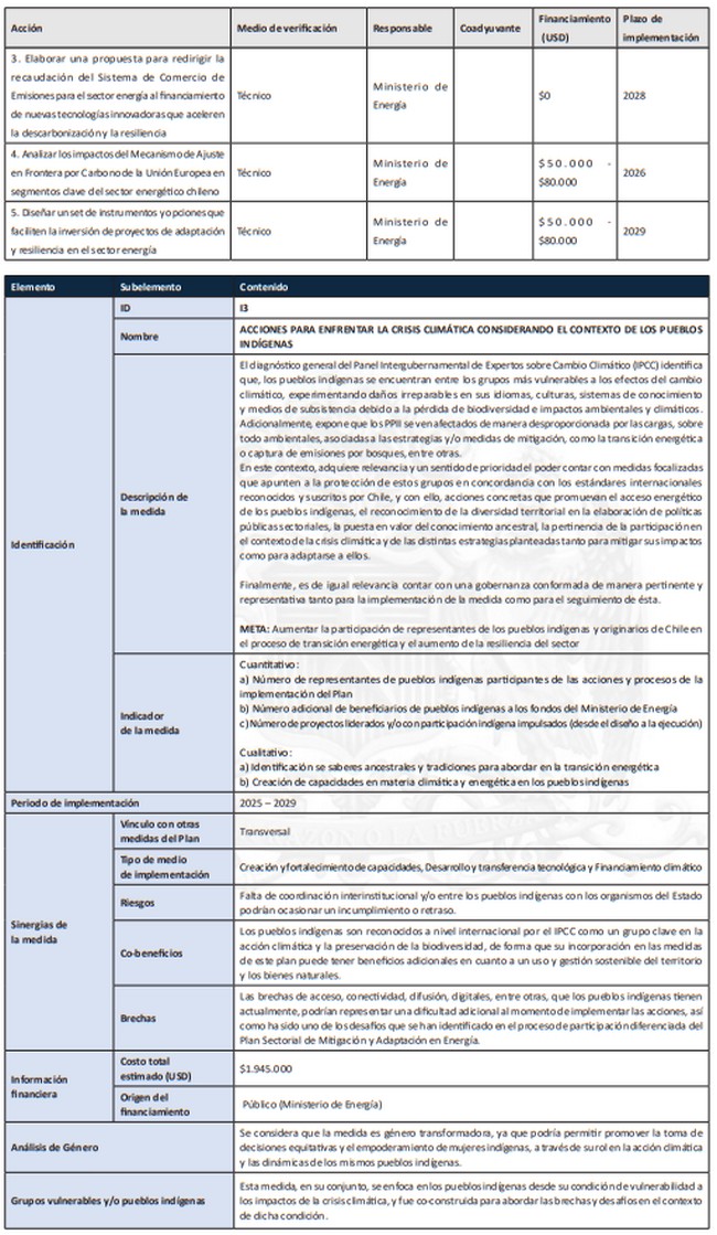 Finalmente, respecto a las medidas de integración/medios de implementación contiene aquellas acciones que son una sinergia entre adaptación y mitigación o abordar otros aspectos del cambio climático. Así, se ha diseñado una medida que incluye los tres medios de implementación de la Ley Marco de Cambio Climático (desarrollo de capacidades, transferencia tecnológica y financiamiento) con foco en fortalecer la implementación del presente Plan. También se incluye una medida enfocada en instrumentos de precio al carbono con foco en la implementación o impulso a los instrumentos como una forma de alcanzar las metas de reducción de emisiones de forma costo-efectiva y generar ingresos para ello. La última medida aborda los desafíos de un grupo vulnerable particular, los pueblos indígenas, en el contexto de transición energética y ha sido co-construida a través de un proceso participativo diferenciado.