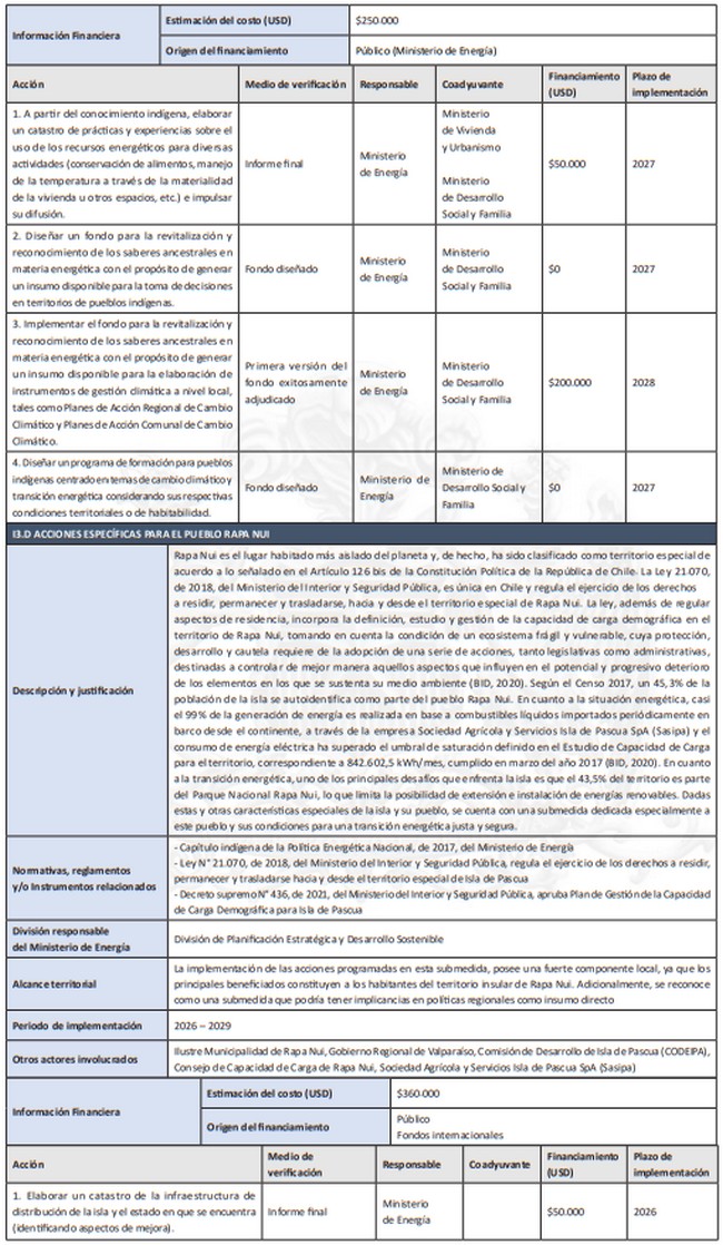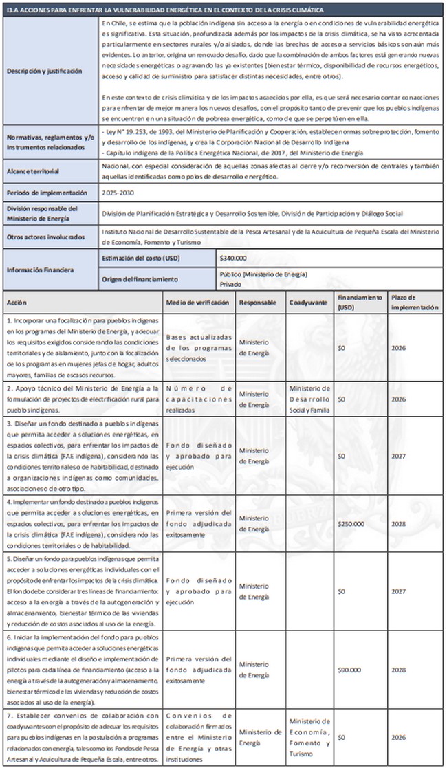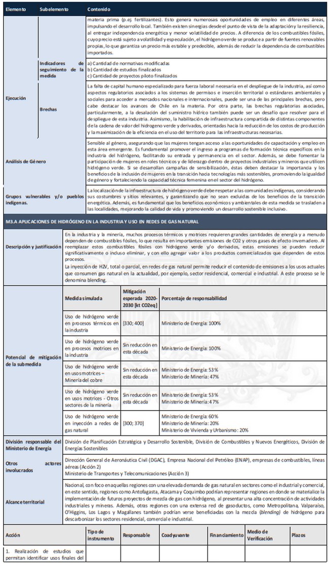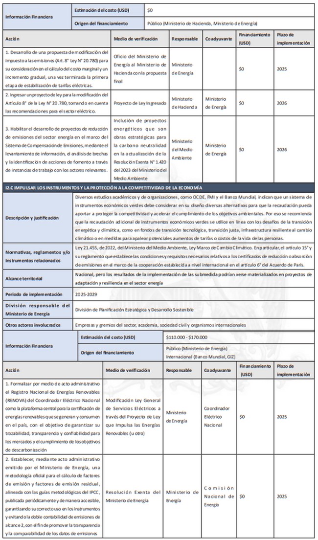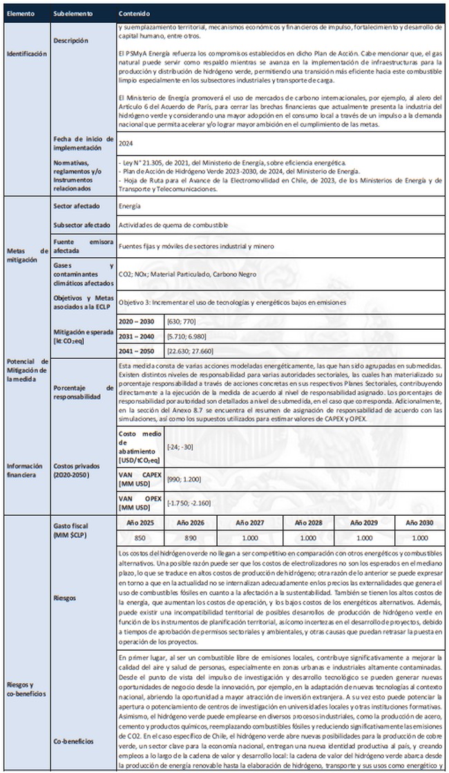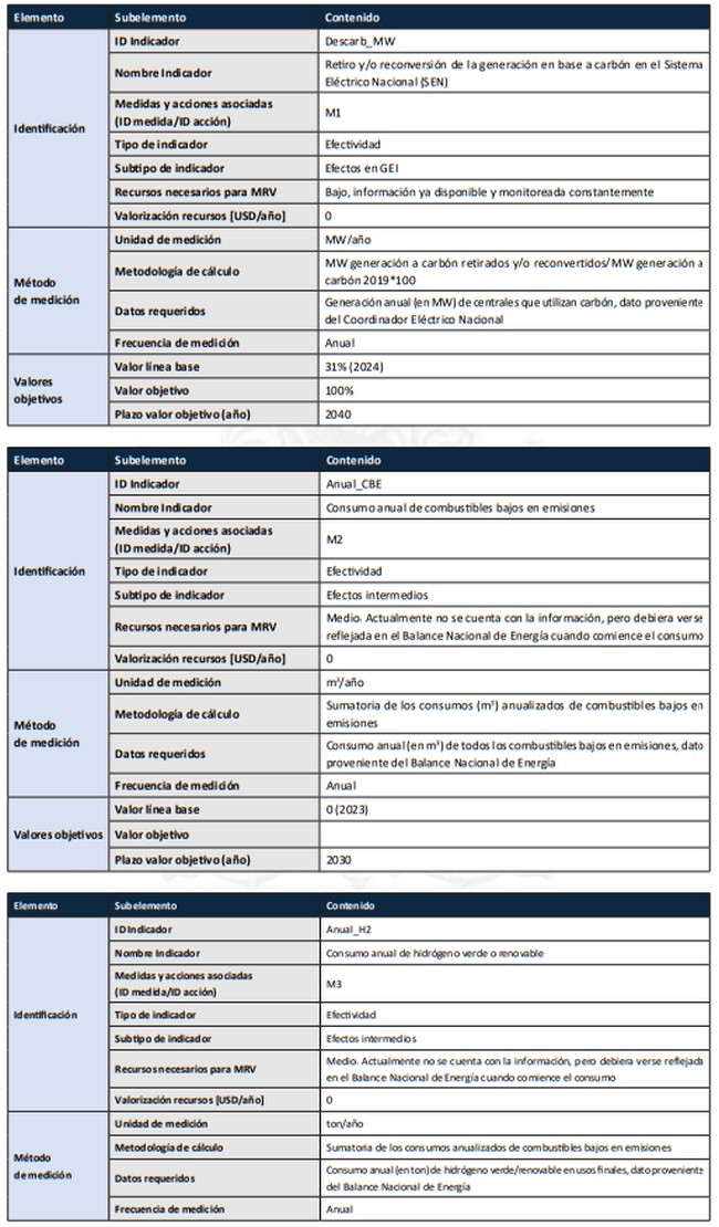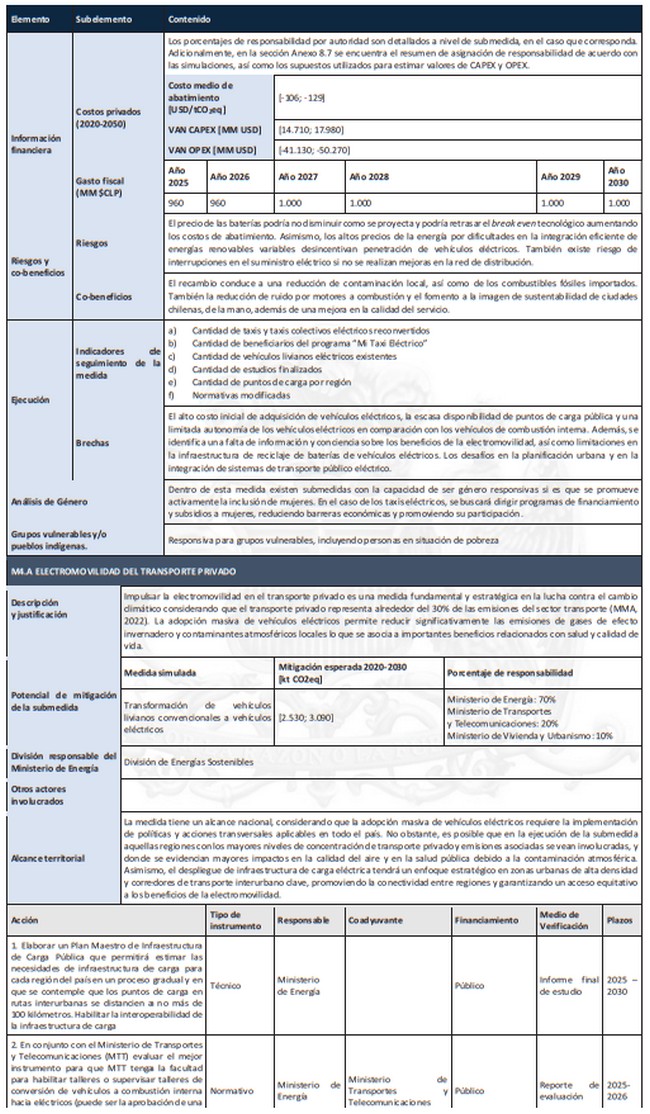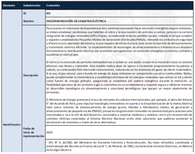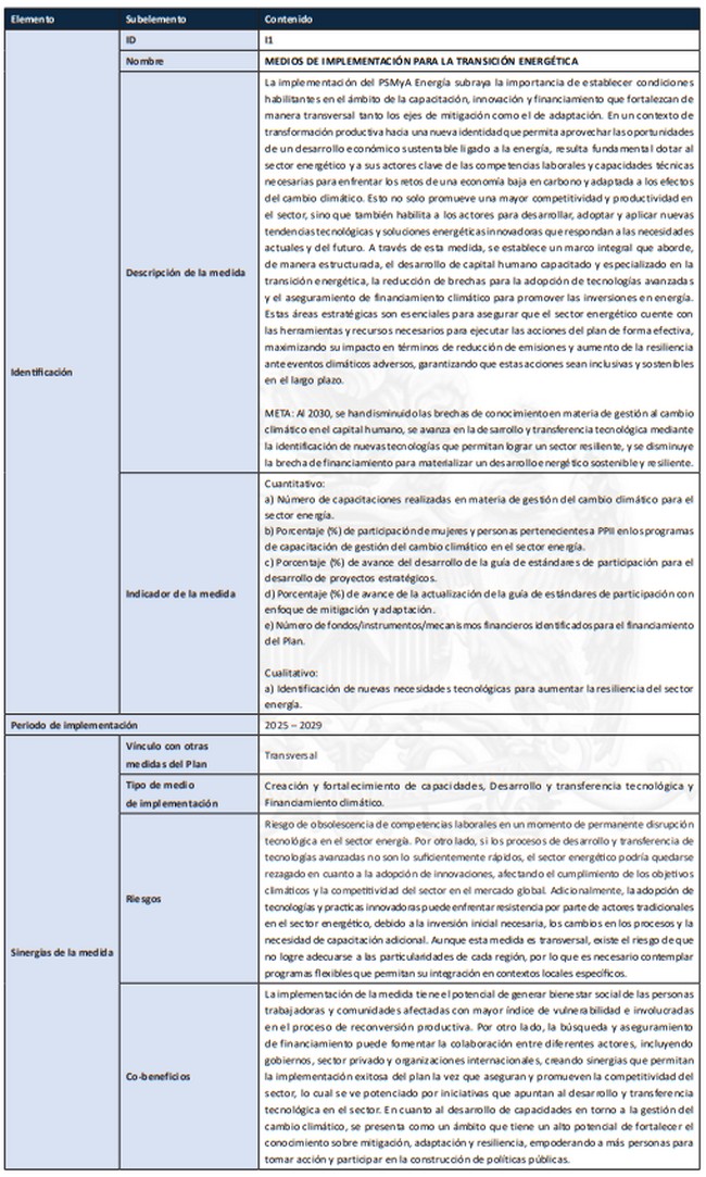 Finalmente, respecto a las medidas de integración/medios de implementación contiene aquellas acciones que son una sinergia entre adaptación y mitigación o abordar otros aspectos del cambio climático. Así, se ha diseñado una medida que incluye los tres medios de implementación de la Ley Marco de Cambio Climático (desarrollo de capacidades, transferencia tecnológica y financiamiento) con foco en fortalecer la implementación del presente Plan. También se incluye una medida enfocada en instrumentos de precio al carbono con foco en la implementación o impulso a los instrumentos como una forma de alcanzar las metas de reducción de emisiones de forma costo-efectiva y generar ingresos para ello. La última medida aborda los desafíos de un grupo vulnerable particular, los pueblos indígenas, en el contexto de transición energética y ha sido co-construida a través de un proceso participativo diferenciado.