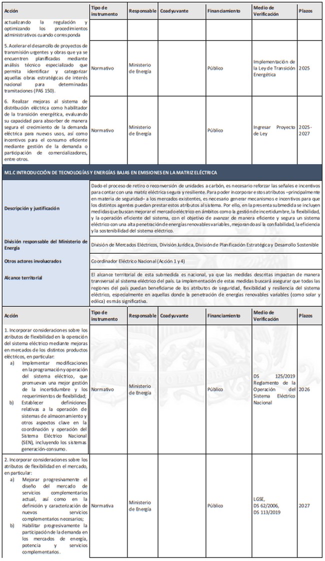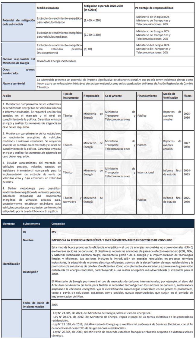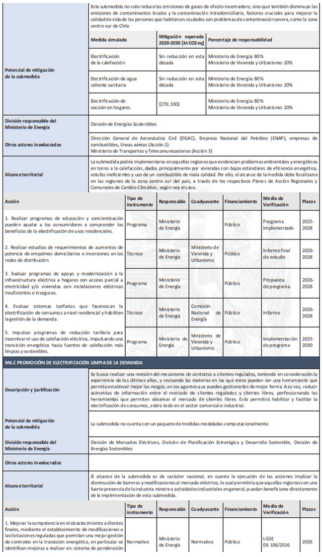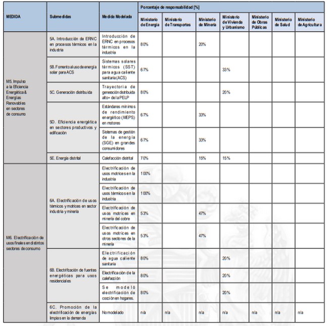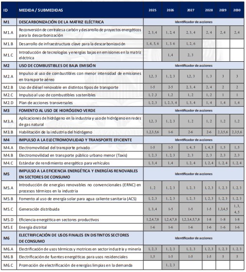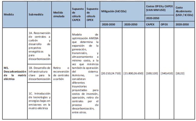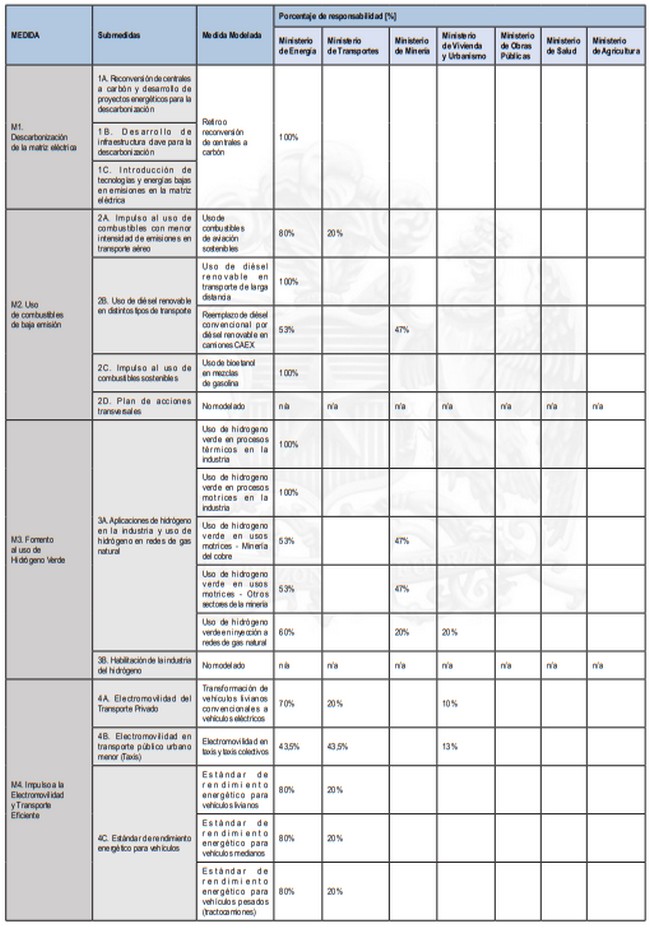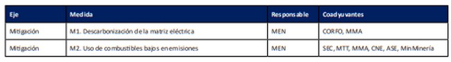 En cuanto a mitigación, se considerando tanto medidas preevaluadas en procesos previos (NDC, ECLP, PELP 2023-2027) así como el levantamiento de medidas complementarias. Así, se simularon y evaluaron 20 submedidas de mitigación en las cuales el Ministerio de Energía tiene un rol de autoridad responsable o coadyuvante, las que fueron agrupadas en las seis medidas. Con esto, se espera un presupuesto de emisiones para el sector durante la década de 264,2 Mt CO2eq, valor 2,8% menor a las 271,8 Mt CO2eq, presupuesto asignado al Ministerio de Energía en la ECLP. La mitigación total esperada de las medidas se encuentra en torno a las 47,2 Mt CO2eq para el periodo 2020-2030, siendo el Ministerio de Energía responsable de un 85,5% de ellas, totalizando así 40,3 Mt CO2eq, a lo que se le suma las emisiones por concepto de coadyuvante, que significa, en total, 1,9 Mt CO2eq mayor que el esfuerzo indicativo de mitigación al 2030 establecido en la ECLP para el Ministerio de Energía. Este margen positivo reduce el riesgo de no cumplimiento del presupuesto asignado en caso de que alguna las medidas o acciones no puedan ser implementadas de forma efectiva. El esfuerzo de mitigación del sector se explica principalmente por la medida "Descarbonización de la Matriz Eléctrica" (M1), que explica alrededor de la mitad de las reducciones esperadas en el periodo del Plan.