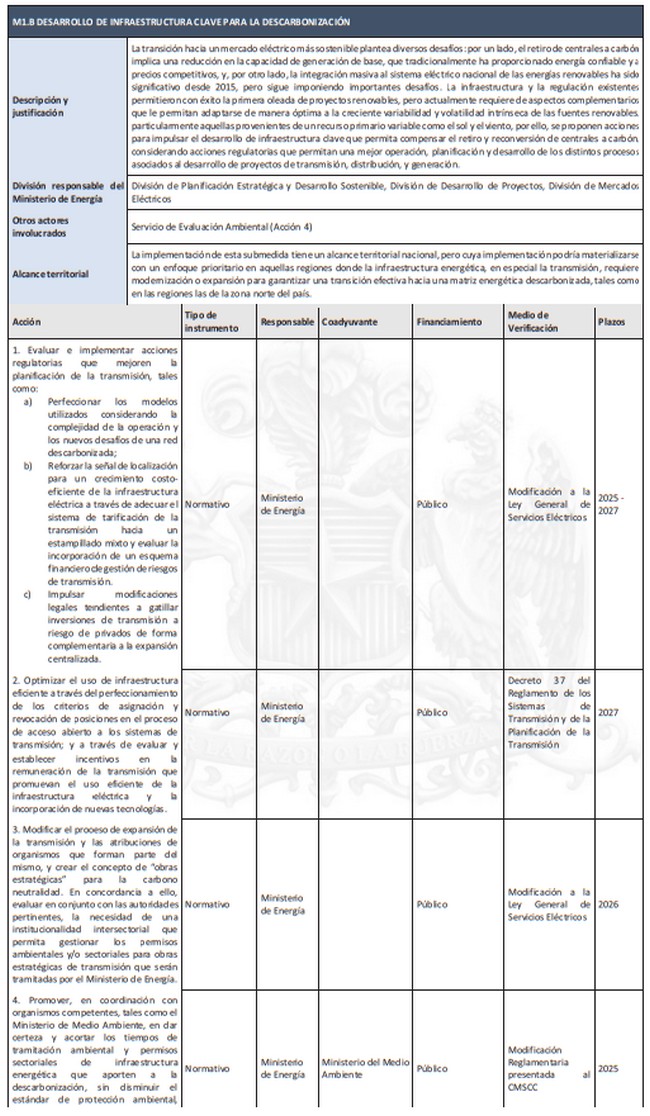 La infraestructura de transmisión eléctrica es clave para habilitar una mayor colocación de energías bajas en emisiones de gases de efecto invernadero, lo que quedó ratificado como tal en la Estrategia Climática de Largo Plazo. Por este motivo, se identificará una cartera de obras de transmisión clave para la descarbonización y la ambición climática, a través de la Planificación Energética de Largo Plazo (PELP), bajo la figura de "Obras Estratégicas", que requieren una participación más activa del Estado para acelerar su ejecución y gestionar el riesgo de su concreción. Estas obras se definirán bajo aplicación de Evaluación Ambiental Estratégica (EAE).