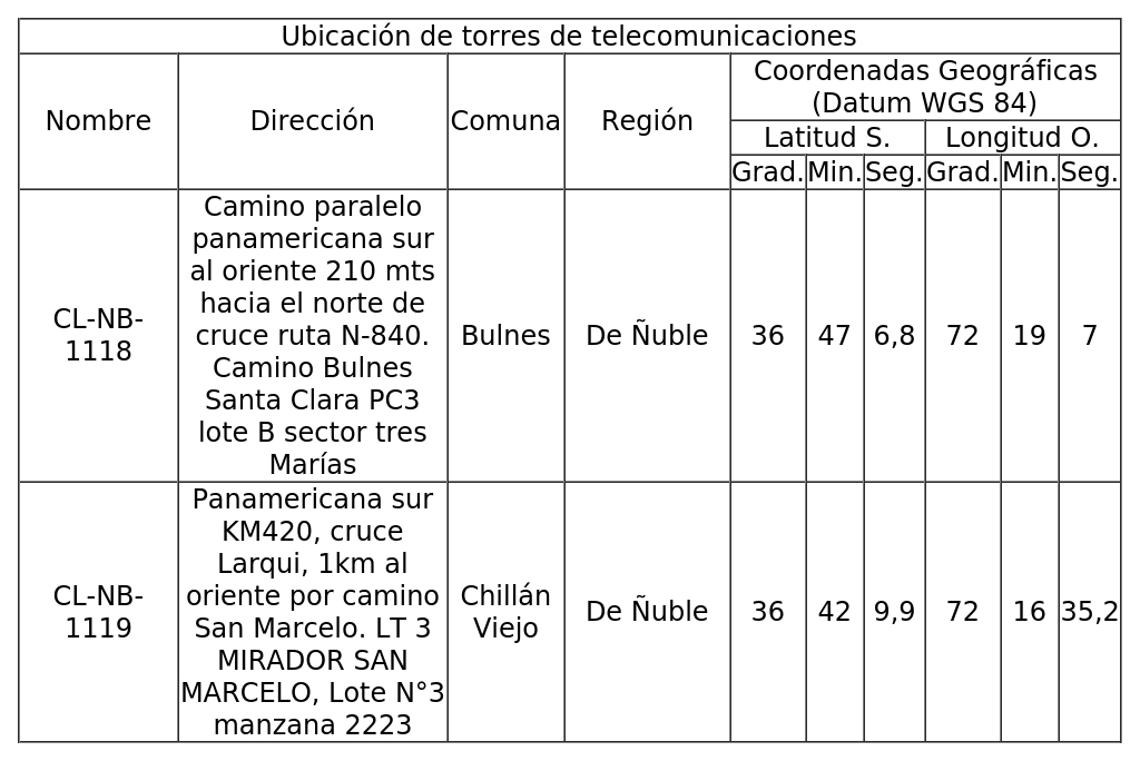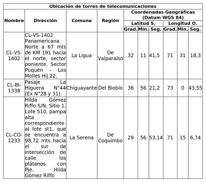 2. Según ingreso Subtel N° 153.808 de 2024, autorízase a la concesionaria para instalar, operar y explotar seis (6) torres de telecomunicaciones, destinadas a soportar sistemas radiantes, según se indica a continuación: