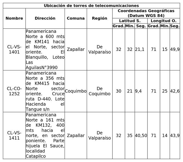 1. Según ingreso Subtel N° 151.830 de 2024, autorízase a la concesionaria para instalar, operar y explotar dos (2) torres de telecomunicaciones, destinadas a soportar sistemas radiantes, según se indica a continuación:
