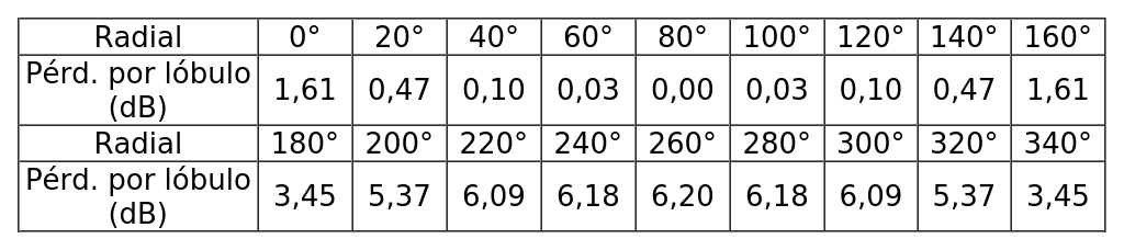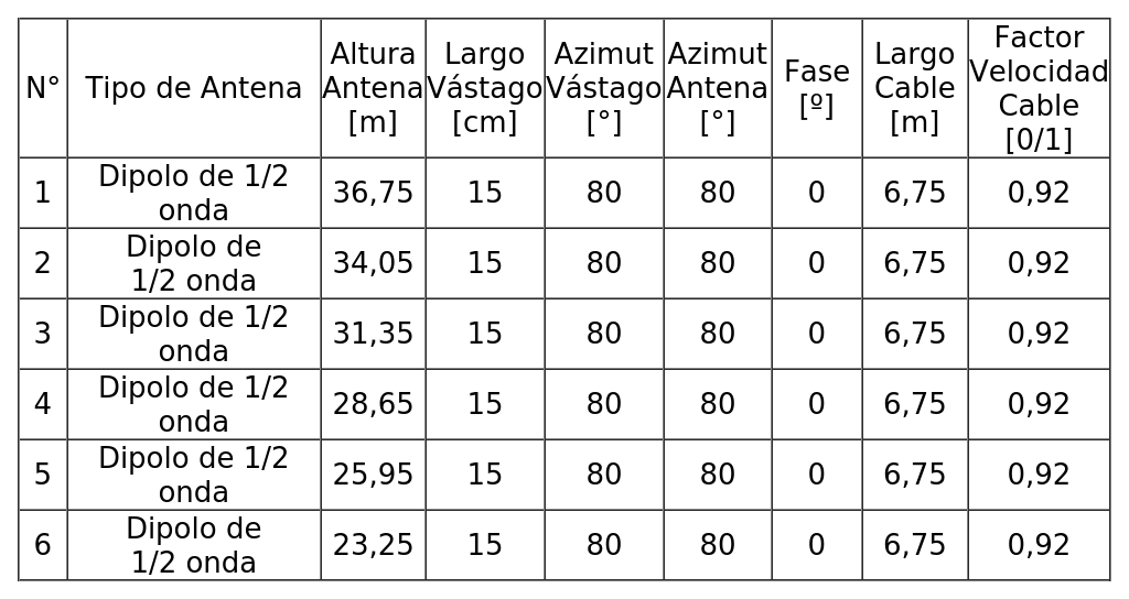 - Arreglo de antenas de acuerdo a la siguiente tabla: