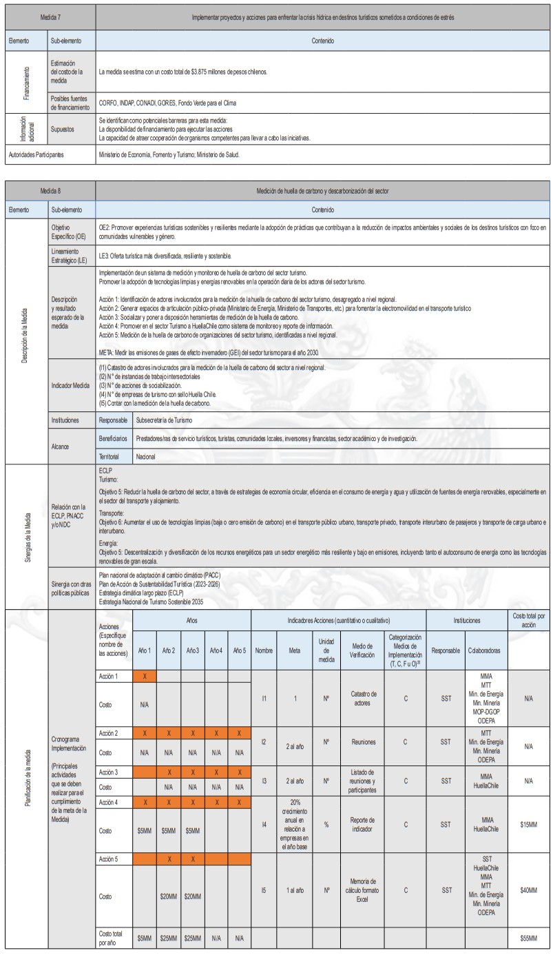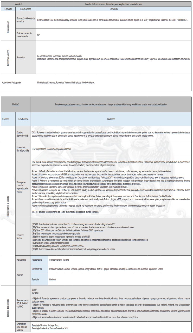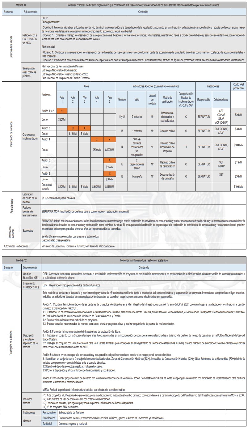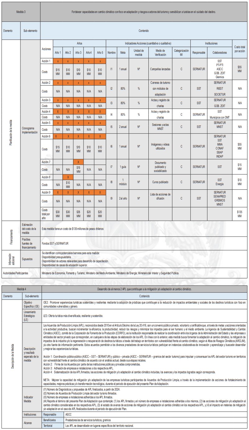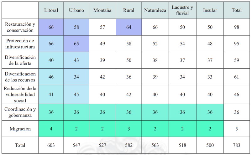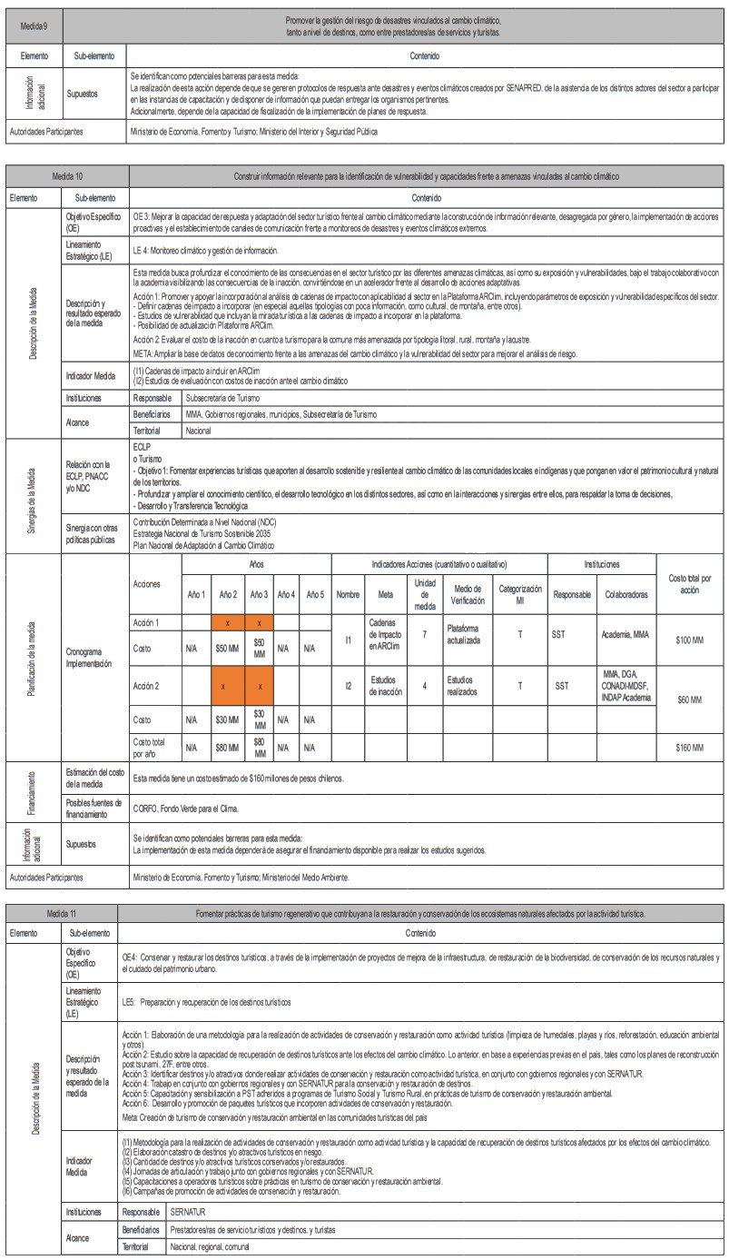 La siguiente tabla corresponde a un resumen de la cantidad de medidas de adaptación por tipología de turismo y tipo de medidas, de acuerdo al levantamiento realizado. En base a esta investigación se identifican las sugerencias de acciones que pueden ser posteriormente analizadas en más detalle por planes regionales y comunales.