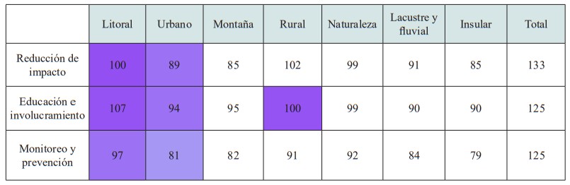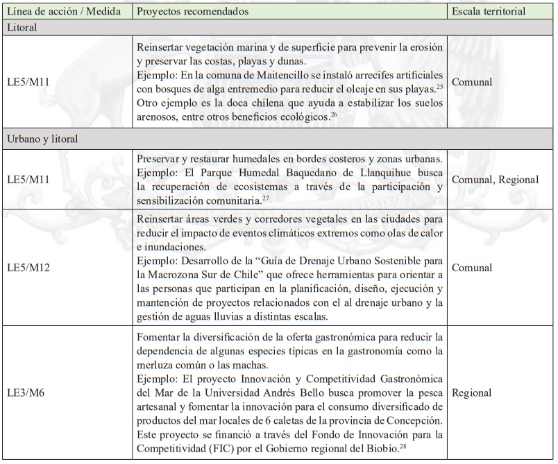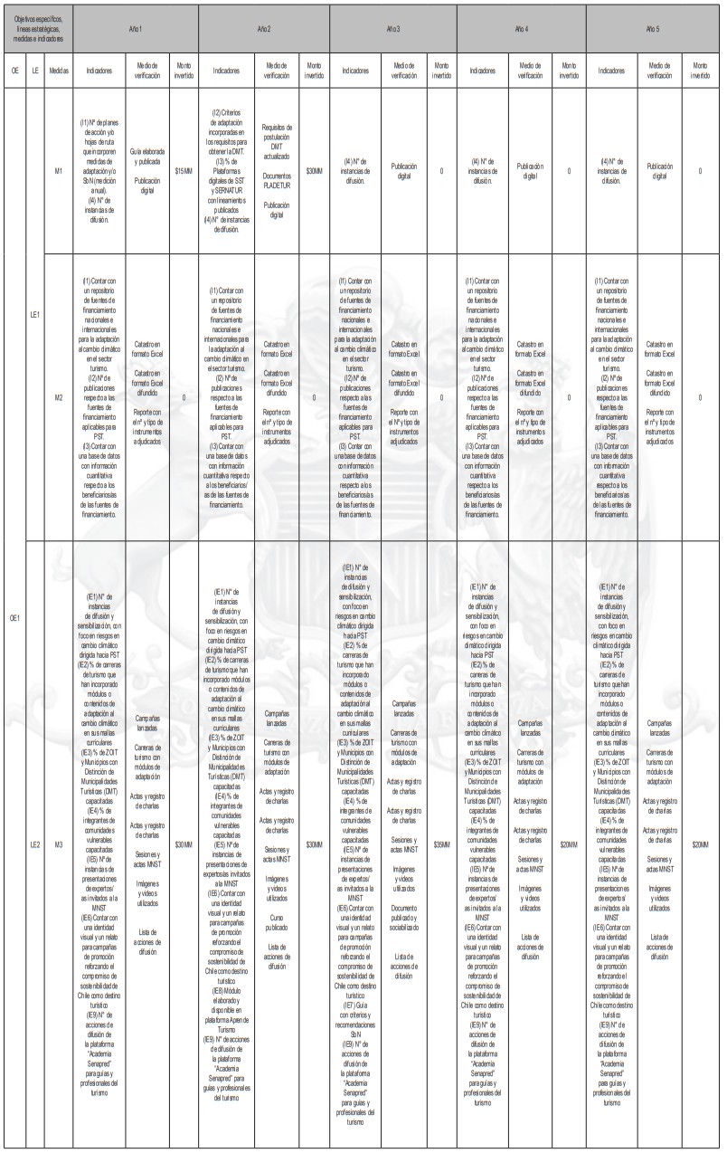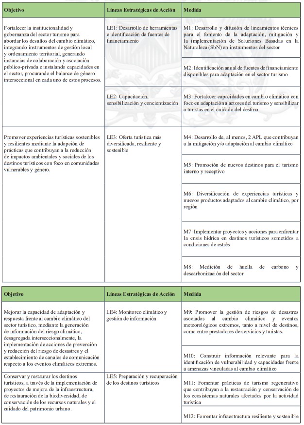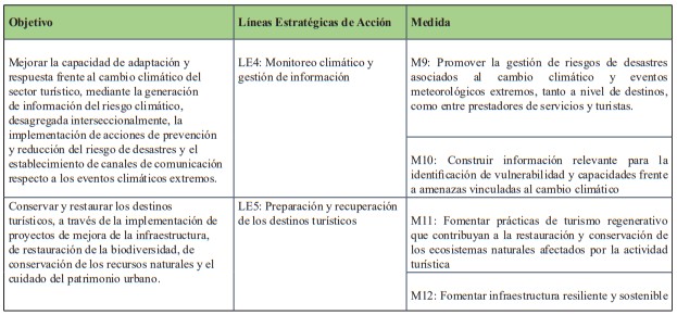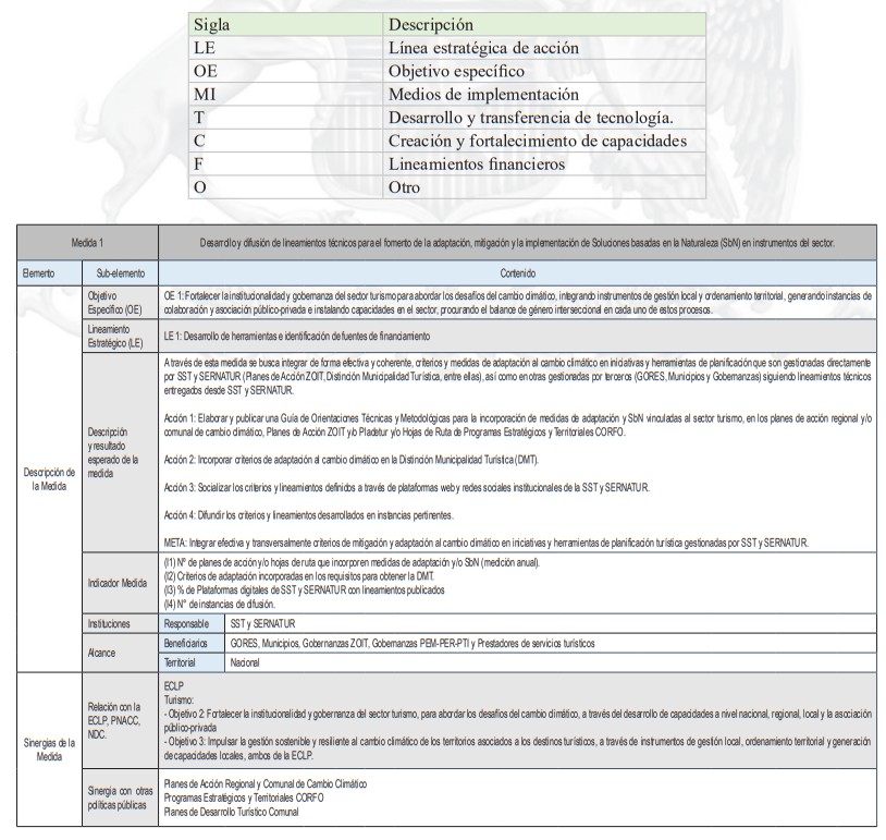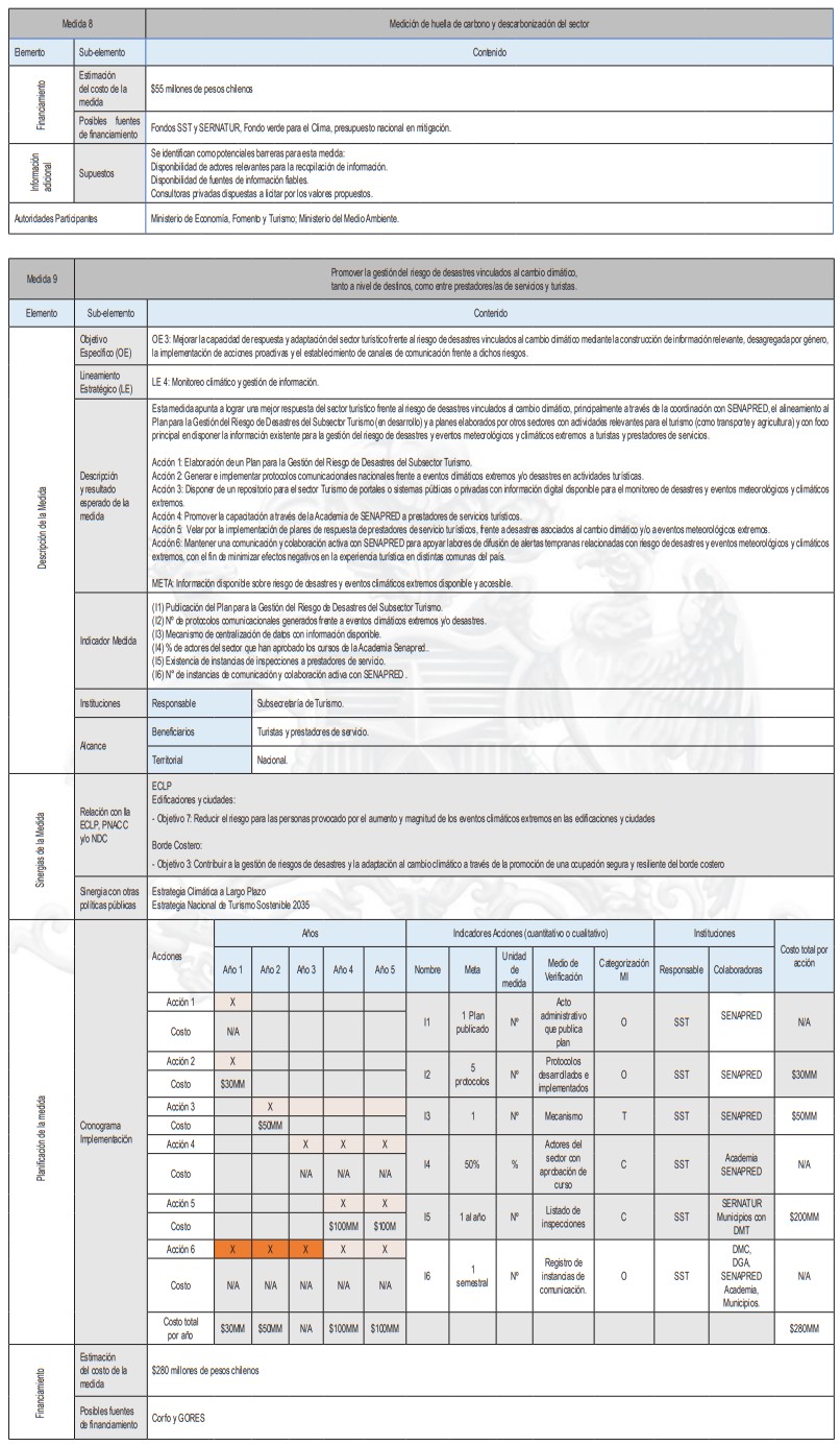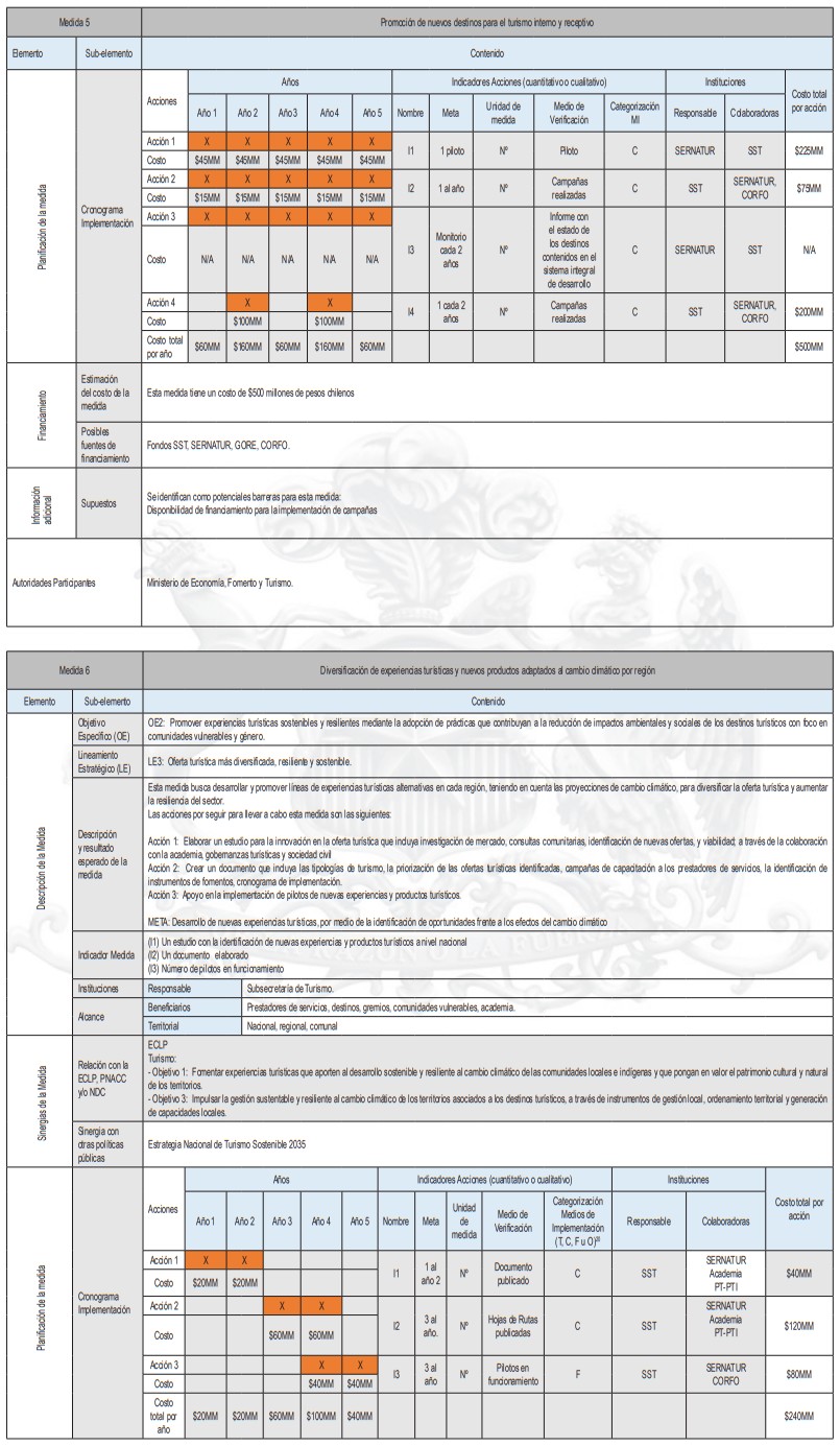 La siguiente tabla corresponde a un resumen de la cantidad de medidas de adaptación por tipología de turismo y tipo de medidas, de acuerdo al levantamiento realizado. En base a esta investigación se identifican las sugerencias de acciones que pueden ser posteriormente analizadas en más detalle por planes regionales y comunales.