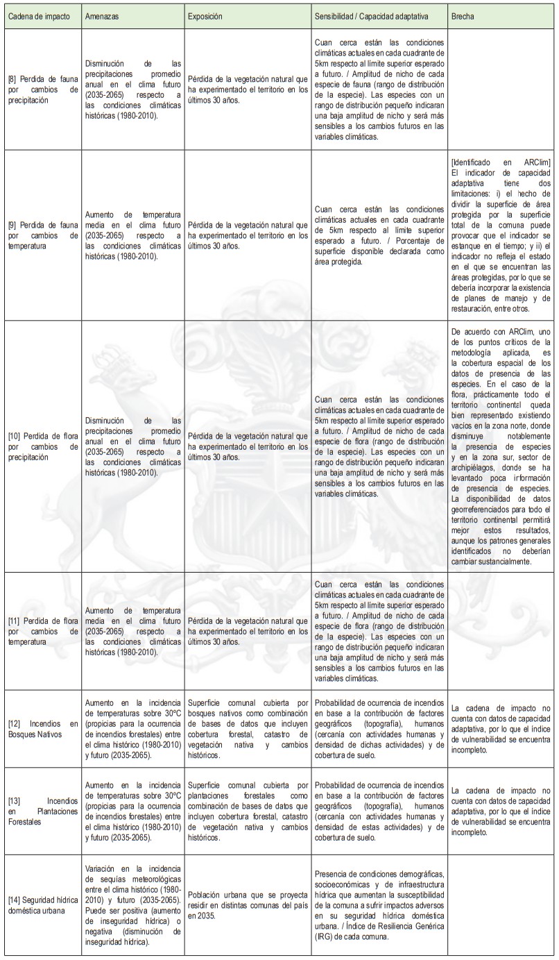 La siguiente tabla contiene las cadenas de impacto analizadas, además de las definiciones de amenazas, exposición, sensibilidad/capacidad adaptativa. Identifica además las brechas de información. La Tabla se elaboró de acuerdo con lo indicador por ARClim.