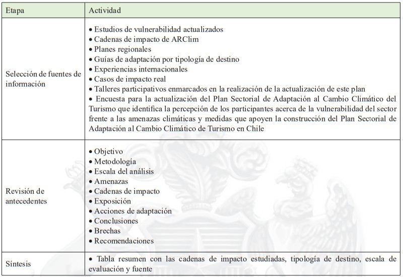 Nota explicativa: La tabla contiene el marco conceptual que se utilizó de manera transversal en materias de contenidos de información, reflejando cada una de las ‘Etapas, y a su vez, las "Actividades" de la revisión de los antecedentes para la construcción del Plan.