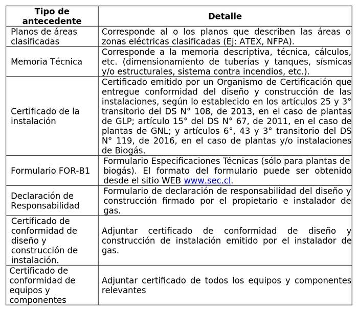 Este trámite se utiliza para declarar electrónicamente ante la Superintendencia las Plantas de Gas nuevas o modificaciones que contemplen el almacenamiento, envasado y/o distribución de GLP a granel o mediante cilindros de GLP; las plantas de recepción, almacenamiento, transferencia o regasificación de GNL; las plantas de biogás y toda instalación donde se realicen las actividades de uso o consumo del biogás provenientes de rellenos sanitarios, previo a su puesta en servicio, las cuales deben cumplir con los requisitos de seguridad establecidos en los decretos supremos N° 108, de 2013, del Ministerio de Energía; N° 67, de 2011 y N° 119, de 2016; respectivamente, todos del Ministerio de Energía.