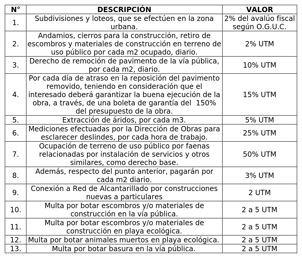 - El decreto alcaldicio N° 666 del 15 de abril de 2009, que aprueba Ordenanza Municipal que Establece Cobro de Derechos, Permisos y Concesiones.