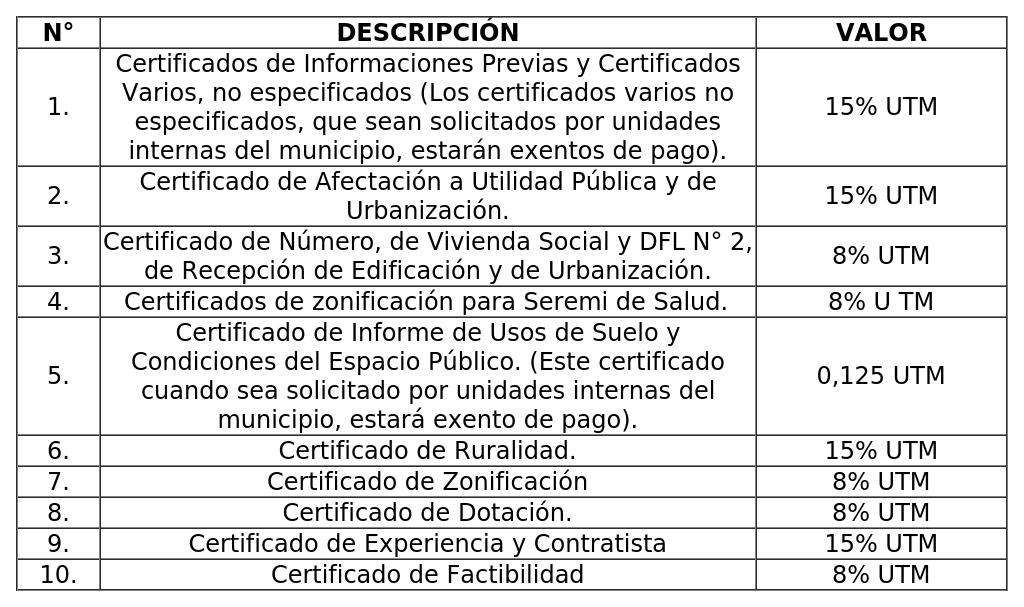 Los servicios, concesiones o permisos relativos a la urbanización y construcción que se señalan más adelante, pagarán los Derechos Municipales que para cada caso se indican, en conformidad a lo dispuesto en el artículo 116, 116 bis f), 126, 127, 128, 129, 130 y 131 de la Ley General de Urbanismo y Construcciones, contenida en el decreto con fuerza de ley N° 458 del Minvu, publicado en el Diario Oficial del día 13 de abril de 1976, otras leyes relacionadas y según lo dispuesto en esta ordenanza.