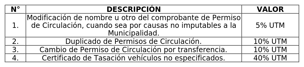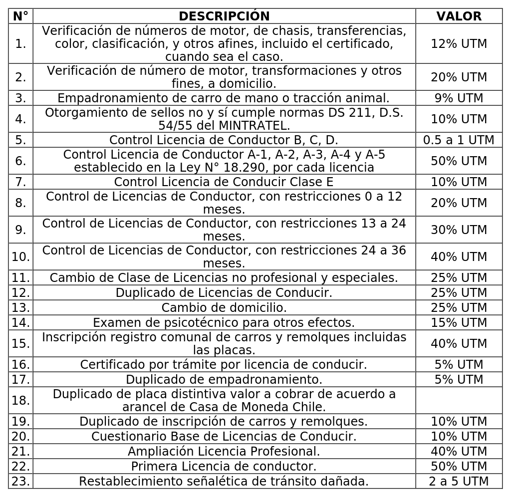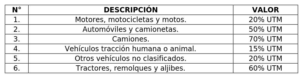 A) Los derechos girados por la Dirección de Tránsito, sin perjuicio del pago de Permisos de Circulación que establece el artículo 12° del decreto ley N° 3.063/79, sobre Rentas Municipales, según la siguiente tabla:
