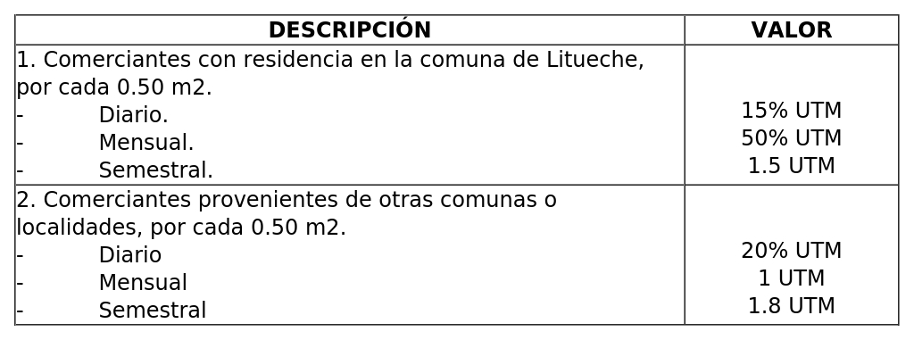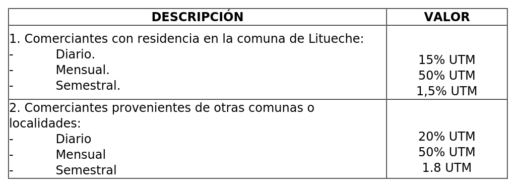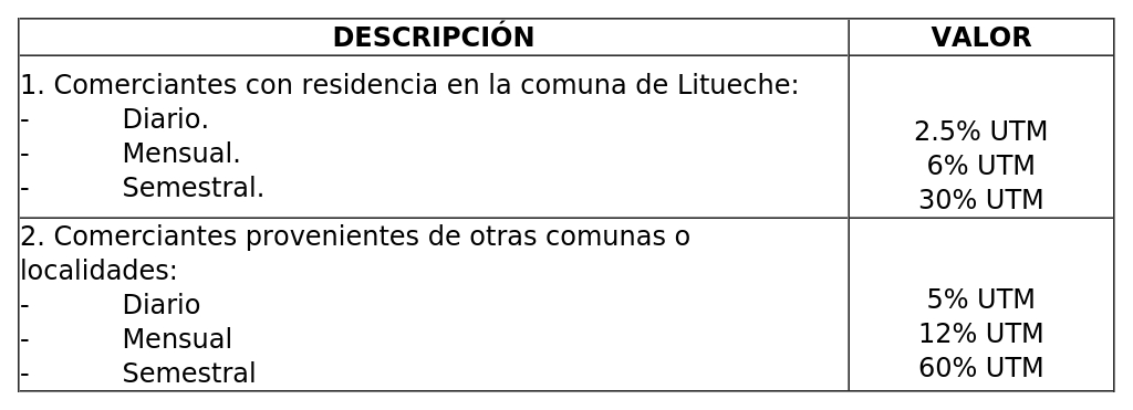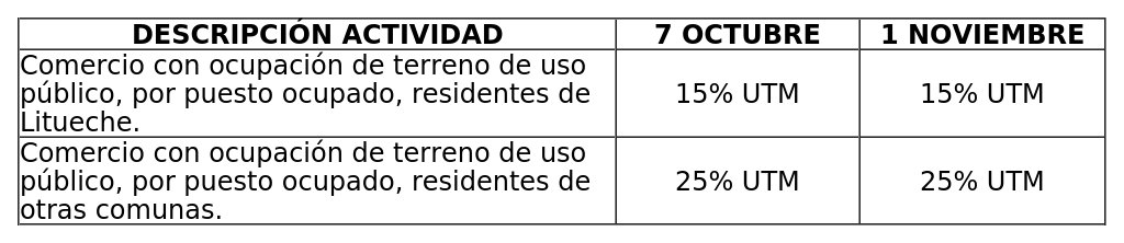 A) Permiso de comercio con ocupación de terreno de BNUP, valores a cobrar por cada puesto ocupado de acuerdo a demarcaciones realizadas en el espacio de uso público donde se instale dicha feria, todos los sábado y de pago semestral, según siguiente tabla: