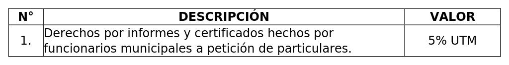 Los derechos fijados para servicios municipales, permisos y concesiones corresponden a cuotas fijas mensuales, con excepción de aquellas en que se indica un lapso distinto.