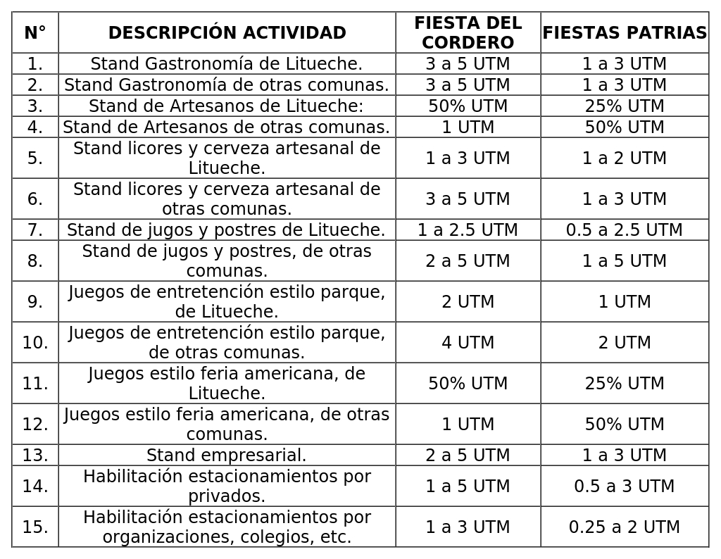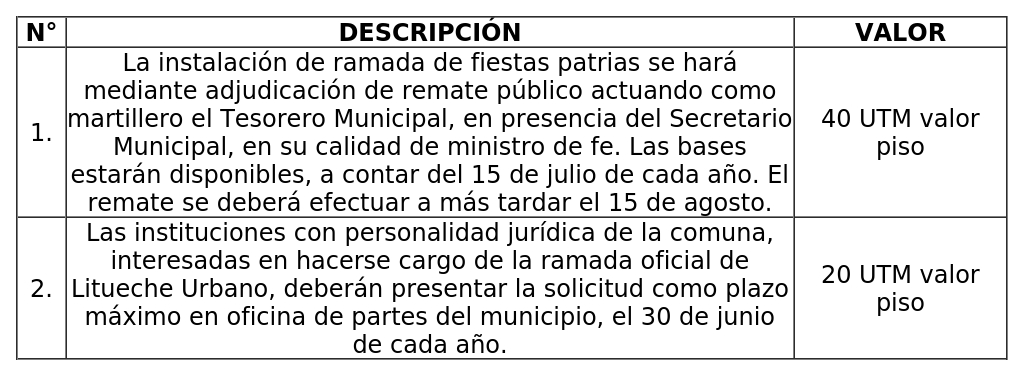 D) Derecho por instalación de ramadas de fiestas patrias, según siguiente detalle: