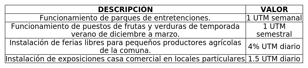 C) Derecho municipal por el funcionamiento de ferias libres, juegos y máquinas de entretención, exposiciones o ferias comerciales en locales particulares, y por la venta de frutas de temporada, según la siguiente tarifa: