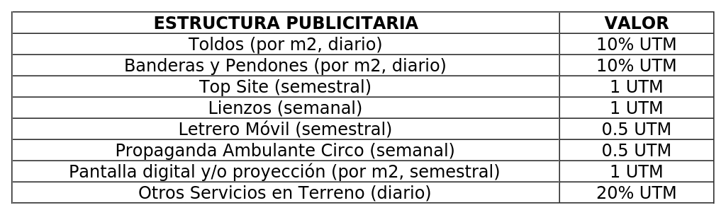 El cobro de derechos municipales por exhibición de publicidad se realizará considerando el tipo de estructura, la cantidad de metros cuadrados y la temporalidad del cobro; de acuerdo con la siguiente tabla: