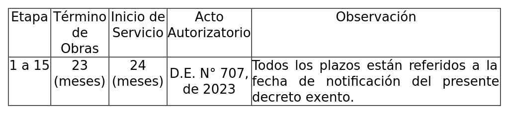 1. Autorízase a la concesionaria para ampliar los plazos de término de obras e inicio de servicio, en la comuna de Antofagasta, Región de Antofagasta, según se indica a continuación, autorizada por decreto exento N° 707, de 2023.