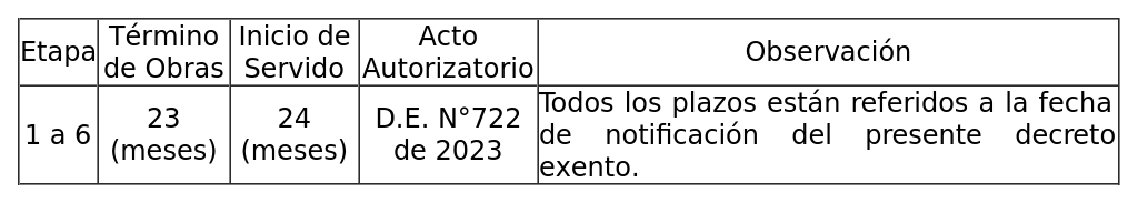 1. Autorízase a la concesionaria para ampliar los plazos de término de obras e inicio de servicio, en la comuna de Penco, Región del Biobío, según se indica a continuación, autorizada por decreto exento Nº 722 de 2023.