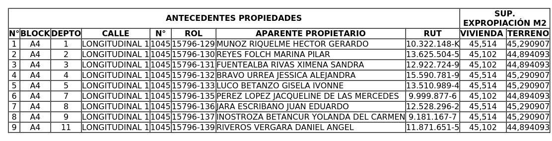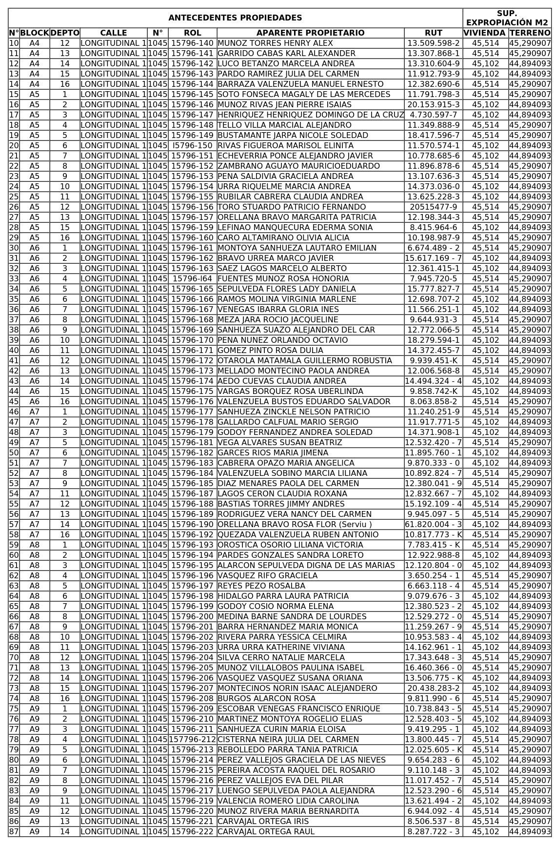 3. Que, la Copropiedad A1, que se ubica en calle Longitudinal 1 N° 1045, de la comuna de San Pedro de la Paz, tiene una superficie de terreno total de 6.312,95 m2, una superficie edificada de 6.343,12 m2 y posee 140 unidades habitacionales. Además, ha sido identificada en el Sistema Integrado de Bienes Inmuebles Serviu (SIBIS) con el código 08-02226.