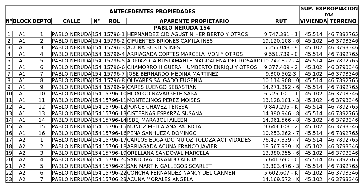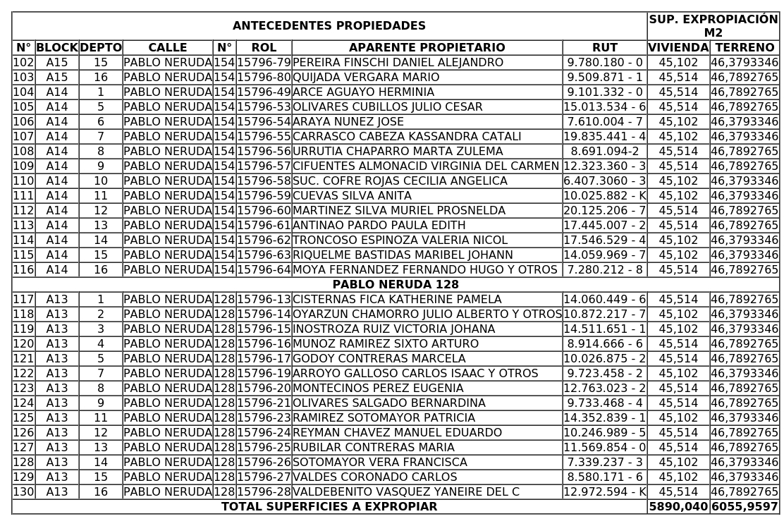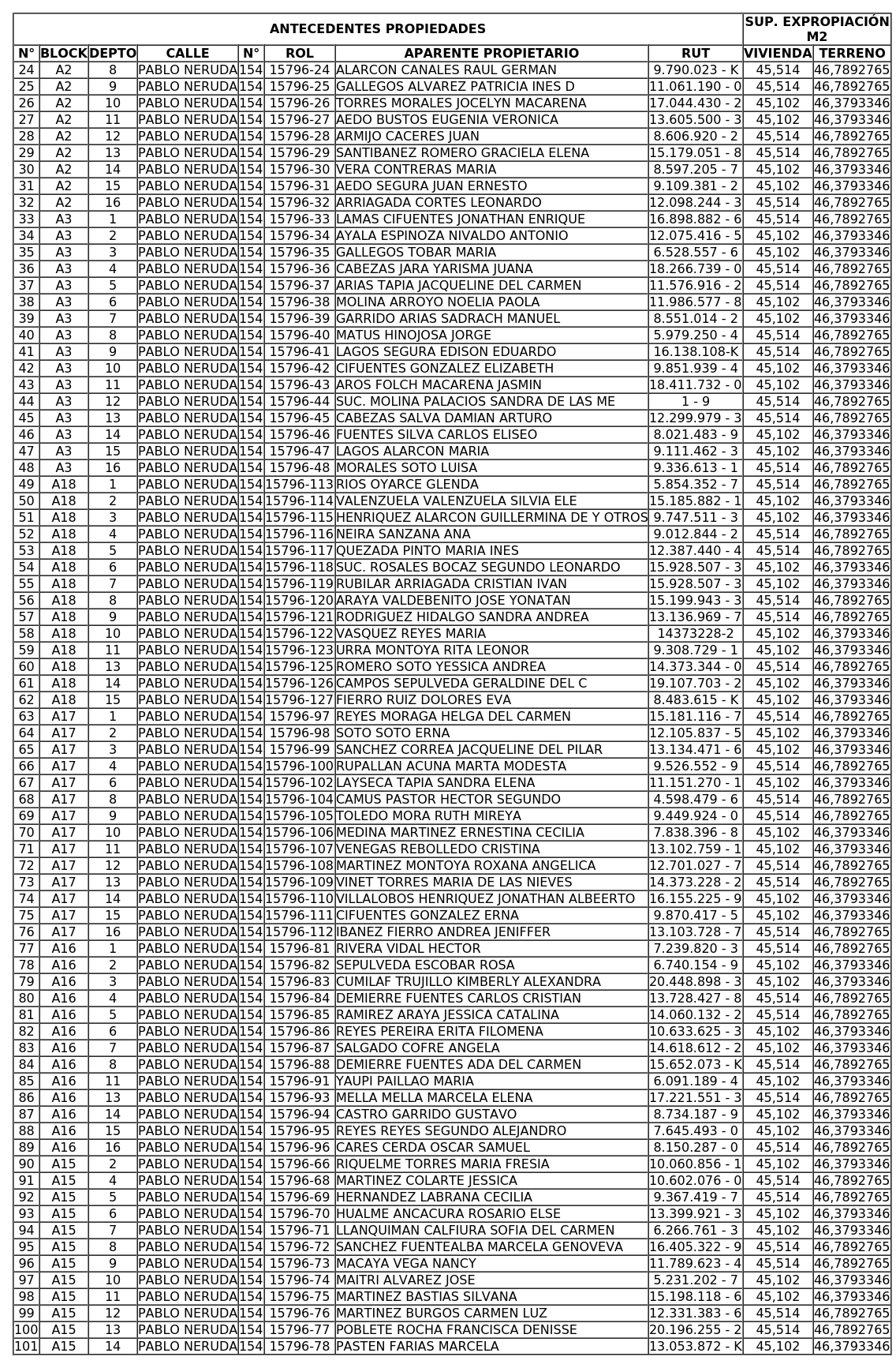 4. Que, la Copropiedad A2, que se ubica en calle Pablo Neruda N° 154 y N° 128, de la comuna de San Pedro de la Paz, tiene una superficie de terreno total de 6.708,14 m2, una superficie edificada de 6.524,35 m2 y posee 144 unidades habitacionales. Además, ha sido identificada en el Sistema Integrado de Bienes Inmuebles Serviu (SIBIS) con el código 08-02227.
