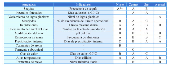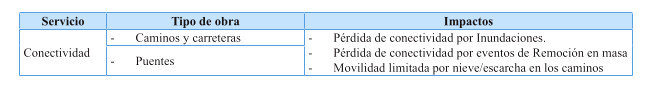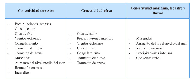 Tabla 1: Amenazas climáticas que pueden interrumpir los servicios de conectividad territorial