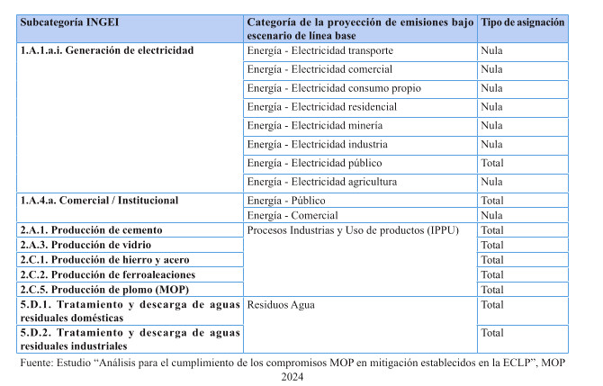 Tabla 8: Asignación original de categorías del INGEI al MOP