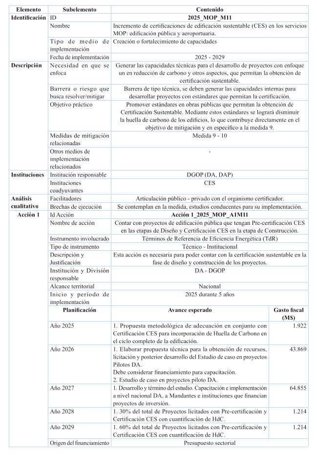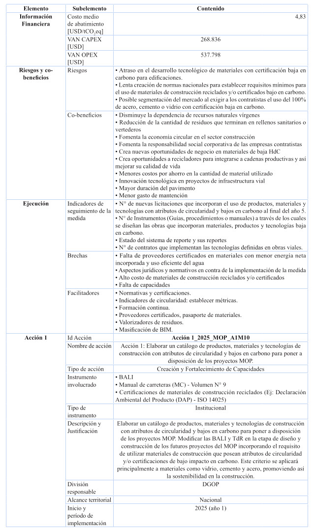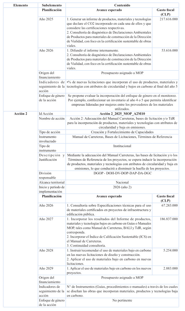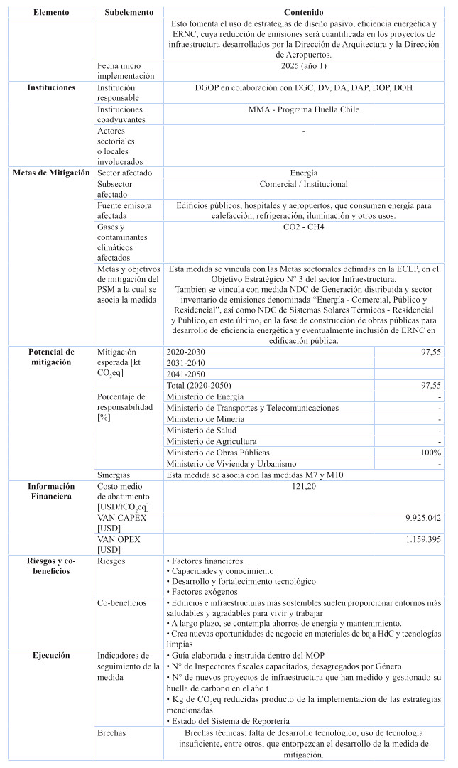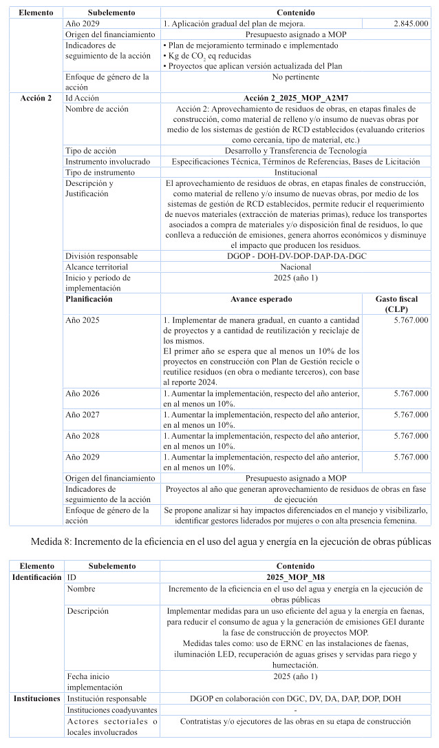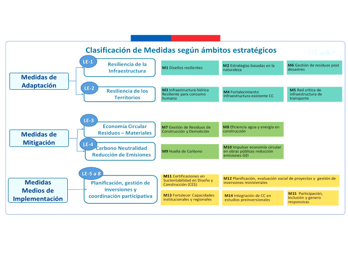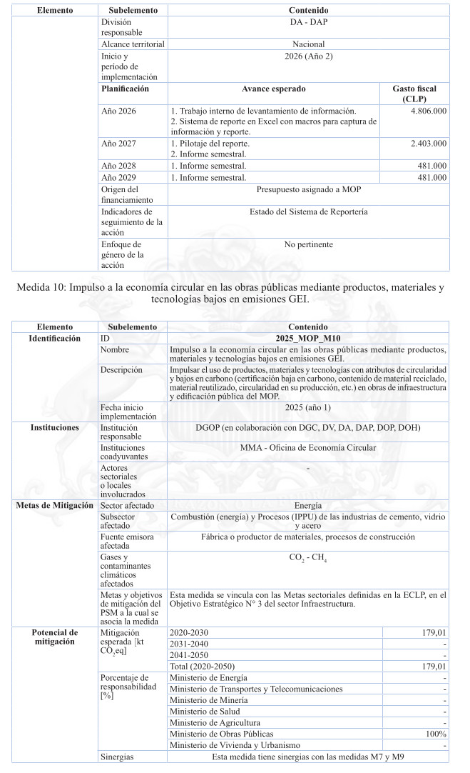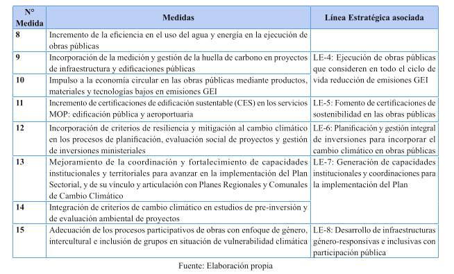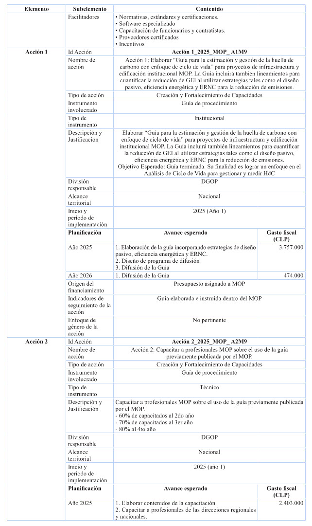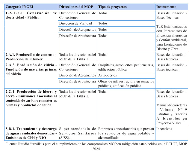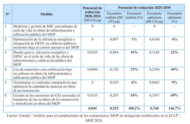 Respecto de las medidas de mitigación, éstas fueron priorizadas en función de su efectividad y el menor costo tanto social, tanto económico y ambiental, dentro del sentido de realidad de las obras públicas. Por tanto, se determina que para el cumplimiento de los presupuestos sectoriales establecidos en la Estrategia Climática de Largo Plazo, es necesario abordar medidas habilitantes que conduzcan a la reducción de emisiones de GEI, por ello se desarrollan medidas asociadas a medición y gestión de huella de carbono en edificaciones MOP, y el impulso a medidas que generan atributos de circularidad con un enfoque en reducción. Cabe destacar, que el Ministerio desarrolló una consultoría el año 2024 para la definición y priorización de las medidas de mitigación denominada "Análisis para el cumplimiento de los compromisos MOP en mitigación establecidos en la ECLP".