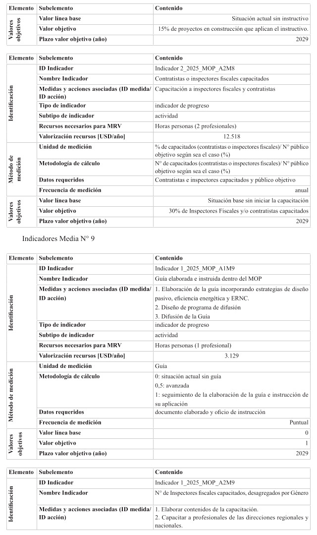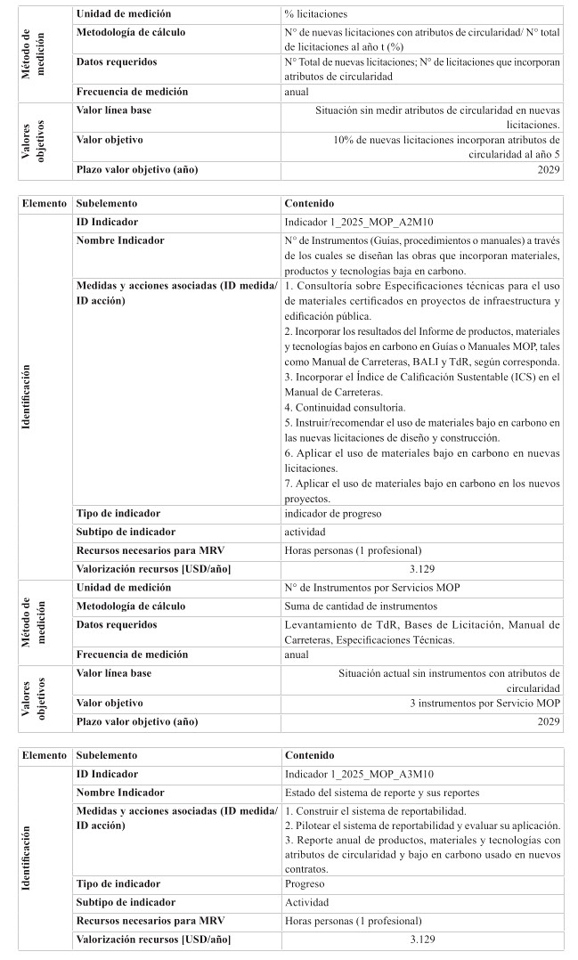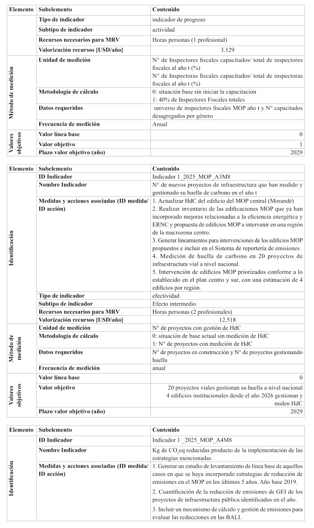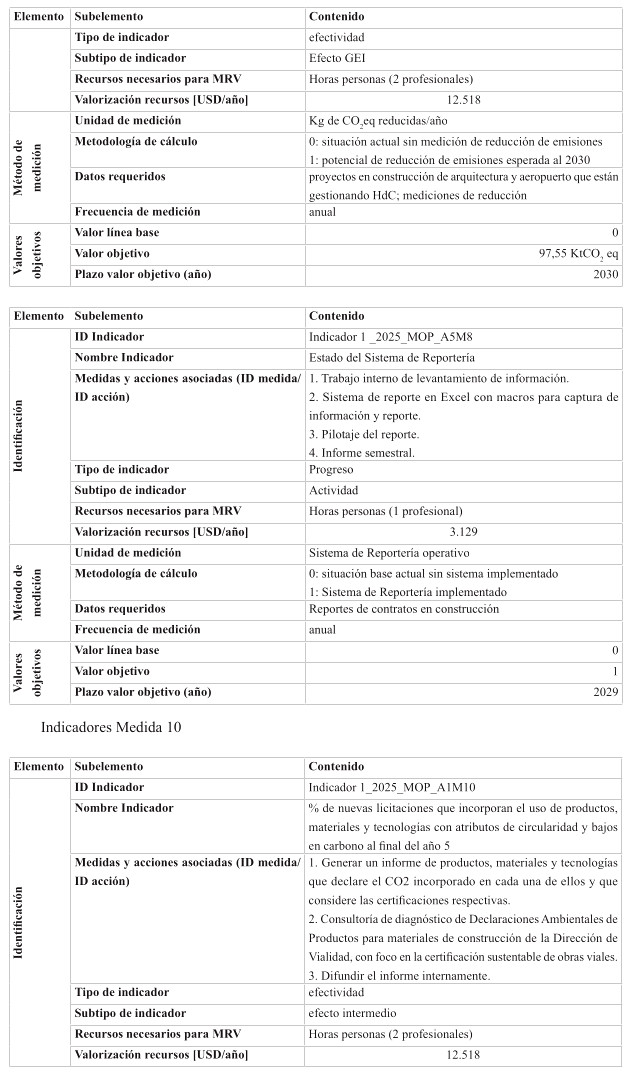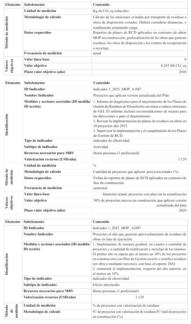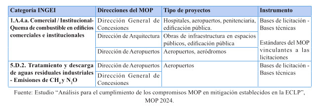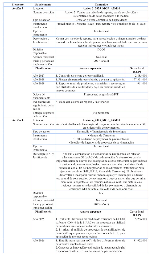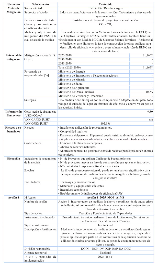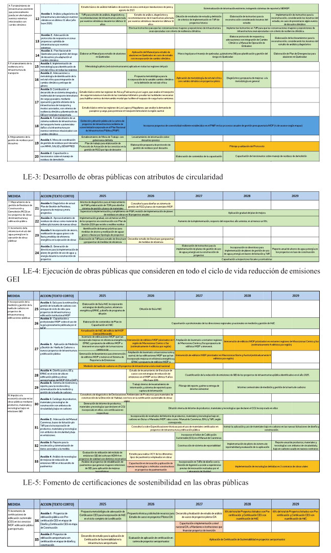 Respecto de las medidas de mitigación, éstas fueron priorizadas en función de su efectividad y el menor costo tanto social, tanto económico y ambiental, dentro del sentido de realidad de las obras públicas. Por tanto, se determina que para el cumplimiento de los presupuestos sectoriales establecidos en la Estrategia Climática de Largo Plazo, es necesario abordar medidas habilitantes que conduzcan a la reducción de emisiones de GEI, por ello se desarrollan medidas asociadas a medición y gestión de huella de carbono en edificaciones MOP, y el impulso a medidas que generan atributos de circularidad con un enfoque en reducción. Cabe destacar, que el Ministerio desarrolló una consultoría el año 2024 para la definición y priorización de las medidas de mitigación denominada "Análisis para el cumplimiento de los compromisos MOP en mitigación establecidos en la ECLP".